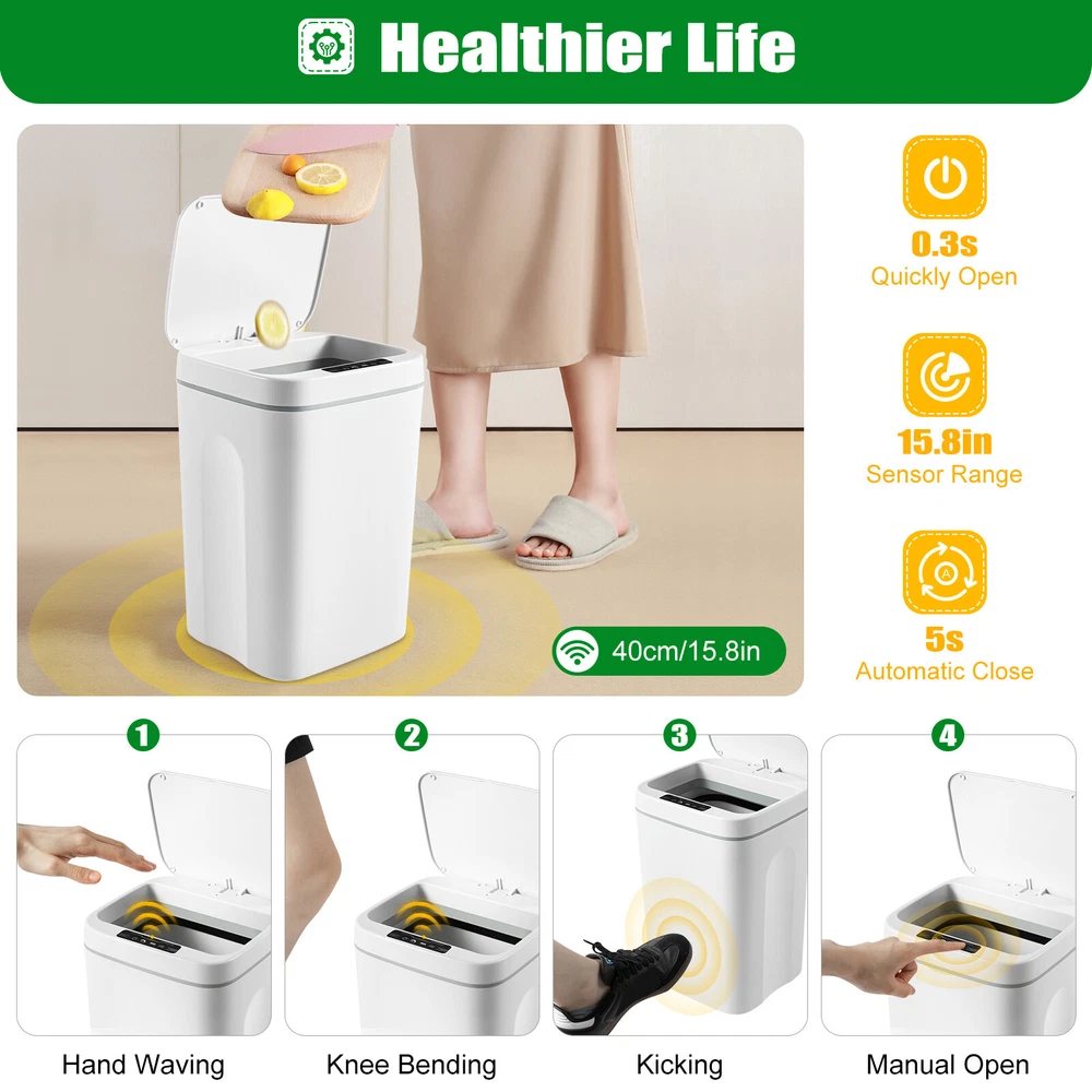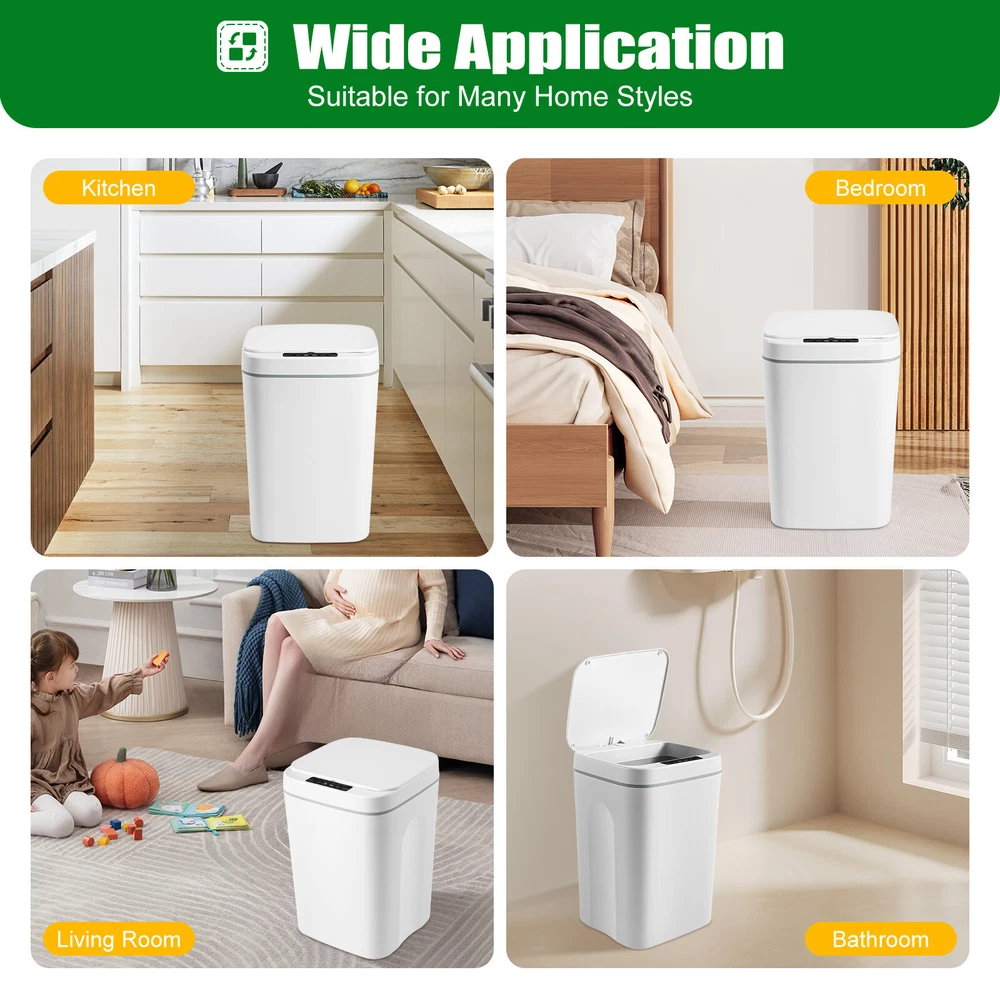 Description: Product Size: 215x205x340mm Weight:0.9kg Product Capacity: 16L Product Battery(Not Included): 4Pcs AA batteries (not included) Product Material: ABS Plastic + PP Material Product Sensing: Infrared Sensing Colour:White Package Included: 1 * Trash Can Note: 1.If you have any problems or concerns, please contact us. 2.Please allow 1-3cm measuring deviation due to manual measurement.Thanks for your understanding. 3.Monitors are not calibrated same, item colour displayed in photos may be showing slightly different from the real object. Please take the real one as standard. Welcome Bathroom Trash Can Touchless 4.22 Gallon Automatic Motion Sensor Smart Trash Can Features: -Sealed design, lock odor. -Automatic opening and closing. Smart chip. Mute ramp down. -Detect every movement accurately. Zero point three Second infrared sensing. -intelligence and control. The sealing design has no peculiar smell. Wave sensing. -0.3S Automatic cover opening. 16L increase capacity. Normally open + inductive dual mode. -The intelligent induction trash can be opened and closed without touching by hand, making it convenient and simple to throw garbage. -Press the normally open button once and the cover will always open. -16 large capacity, which can be used by many people at the same time. It is suitable for kitchen, bedroom, bathroom, living room and balcony. -When the battery is exhausted and there is no replacement battery, it can be opened manually under no power condition. Description: Product Size: 215x205x340mm Weight:0.9kg Product Capacity: 16L Product Battery(Not Included): 4Pcs AA batteries (not included) Product Material: ABS Plastic + PP Material Product Sensing: Infrared Sensing Colour:White Package Included: 1 * Trash Can Note: 1.If you have any problems or concerns, please contact us. 2.Please allow 1-3cm measuring deviation due to manual measurement.Thanks for your understanding. 3.Monitors are not calibrated same, item colour displayed in photos may be showing slightly different from the real object. Please take the real one as standard. Payment Delivery details Terms of sales About us Contact us Payment We accept ebay payment 。 Fees such as import duties, taxes are not included in the item price or shipping costs. These charges are the buyer's responsibility. Delivery details Shipping: 2-9 working days to: USA Terms of sales We maintain high standards of excellence and strive for hundred percent customer satisfaction. Feedback is very important to us. We hope that you contact us immediately before you give neutral or negative feedback, so that we can address your concerns. It is impossible to address issues if we do not know about them! About us Your satis faction is our ultimate goal. We work hard to earn your trust and future business. Our certified technicians have tested each item before shipping. The unit comes with 1 year limited warranty on all manufacturing defects. a) If you receive a defective item, you may return it or ask for a discount. Please contact us within 14 days after you receive the package. b) What you returned must be intact and in its original packaging as re? u. Customer is responsible for shipping costs of the returned item. c) We will cover the cost of shipping back t with the shipping rate indicated in the registration page. We will send you a new unit or refund the full payment you paid. Thank you. Contact us Business Hour Business Hour: Monday To Friday: 8:30 AM to 5:00 PM (Beijing China time) Due to time zones, our reply to your questions may not be immediately. But within above working time, we will reply your email within 24 hours. If it's non-workdays, please kindly be patient and wait till Monday. Please contact us with ebay message. Please feel free to contact us if you have any questions. Monday To Friday: 8:30 AM to 5:00 PM (Beijing China time) Due to time zones, our reply to your questions may not be immediately. But within above working time, we will reply your email within 24 hours. If it's non-workdays, please kindly be patient and wait till Monday. Please contact us with ebay message. Please feel free to contact us if you have any questions.