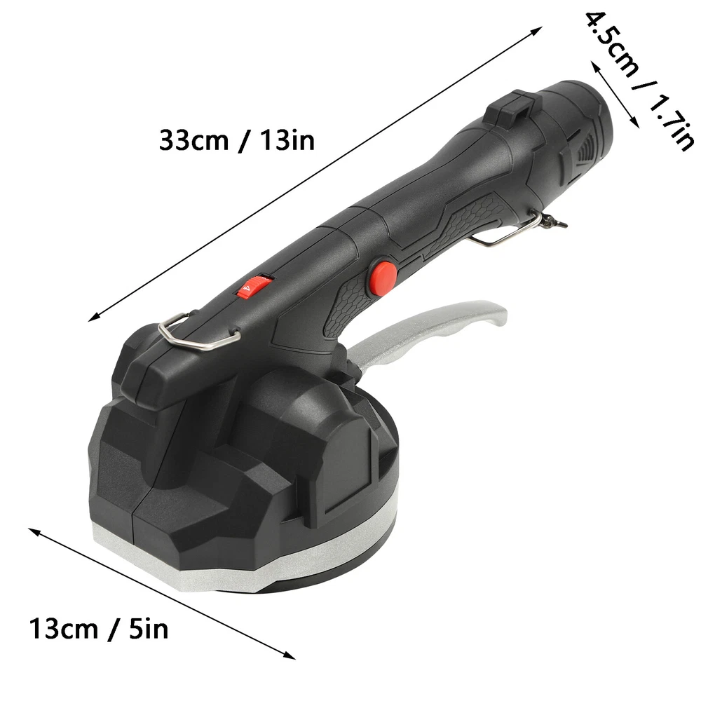 Specification Color: Black Material: ABS, Aluminum Alloy, Rubber Power Source: Battery Powered Plug Standard: US Standard Motor Type: Pure Copper Motor Surface Recommendation: Tile Battery Type: 2* 12V 1500mAh Lithium Battery(Included) Endurance (Low Gear): 2-4h Charging: About 3h Number of Gears: 6 Rotational Speed: 10000r/min Adsorption Power: 60-80kg/132.3-176.4 lbs Applicable Tiles: <100*100mm/3.93*3.93in Noise: About 50dB(Highest Gear) Power Cord: 98cm/38.6in Handle Size(L*W) : 33*4.5cm/13*1.7in Suction Cup Diameter: 13cm/5in Plastic Storage Box Size: 39*18*15cm/15.3*7.1*5.9in Package Size: 39*18*16cm/15.3*7.1*6 in Net Weight: 3kg/6.6 lbs Gross Weight: 3.5kg/7.7 lbs Package Included 1 x Tile Laying Machine 2 x Batteries 1 x Charger 1 x English Manual 1 x Plastic Storage Box Automatic Tile Vibrator Suction Cup Floor Laying Machine Leveling Tool Hand-Held Tile Machine Electric Tile Vibrator with 130 mm Suction Cup 6 Speeds Adjustable 60-80 kg Load Capacity Tile Tile Machine Application It is suitable for engineering teams and home use to move and install wall/floor tiles smaller than 3.93*3.93in. It is ideal for laying various tiles such as wall tiles, floor tiles, bathroom tiles, and TV wall tiles in living rooms, kitchens, bathrooms, and more. Specification Color: Black Material: ABS, Aluminum Alloy, Rubber Power Source: Battery Powered Plug Standard: US Standard Motor Type: Pure Copper Motor Surface Recommendation: Tile Battery Type: 2* 12V 1500mAh Lithium Battery(Included) Endurance (Low Gear): 2-4h Charging: About 3h Number of Gears: 6 Rotational Speed: 10000r/min Adsorption Power: 60-80kg/132.3-176.4 lbs Applicable Tiles: <100*100mm/3.93*3.93in Noise: About 50dB(Highest Gear) Power Cord: 98cm/38.6in Handle Size(L*W) : 33*4.5cm/13*1.7in Suction Cup Diameter: 13cm/5in Plastic Storage Box Size: 39*18*15cm/15.3*7.1*5.9in Package Size: 39*18*16cm/15.3*7.1*6 in Net Weight: 3kg/6.6 lbs Gross Weight: 3.5kg/7.7 lbs Package Included 1 x Tile Laying Machine 2 x Batteries 1 x Charger 1 x English Manual 1 x Plastic Storage Box Description This tile-laying machine is made of high-quality ABS, aluminum alloy, and rubber. 6-speed adjustment allows you to change the vibration frequency according to the size of the tiles and 132.3-176.4 lbs adsorption capacity assists you in adjusting the position of the tiles. The easy-to-use switch and speed button, and the ergonomic handle allow you to say goodbye to manual tiling, nad reduce the rate of breakage. Key Features ✅Build to Last: High-quality ABS and rubber are strong and durable, together with the aluminum alloy shell that is highly effective at dispersing heat, making the machine maintain excellent function for a long time. ✅Excellent Function: Adopting a pure copper motor and a thickened rubber suction cup of 5" in diameter, this machine has high-frequency vibration(10000rpm), high efficiency, and a strong adsorption force of about 132.3-176.4 lbs, making it suitable for moving and installing floor tiles and wall tiles while reducing the risk of falling, damage, or cracking. ✅Adjustable Speed: You can adjust the speed within 6 gears according to the size of the tile(3.93*3.93in) and the thickness of the plaster through the scroll button, enabling you to accurately level tiles and saving you time and effort. ✅Thoughtful Design: The ergonomic anti-slip handle and 6.6 lbs weight allow you to achieve one-handed operation with less effort while reducing fatigue. ✅Uninterrupted&Conveninent Work: The two rechargeable 1500mAh lithium batteries with jack-type design allow for easy installation&charging and provide 2-4 hours battery life on a 3-hour charge (each at the lowest gear) without worrying about insufficient electricity that interrupts your work. And the cordless design enables you to use this machine anytime and anywhere. ✅Easy to Store and Carry: The detachable batteries and plastic storage box(15.3*7.1*5.9in) with handle and buckle designs allow you to easily store the product and take it anywhere, while also preventing item loss. Easy to Operate: The convenient switch, speed button, adsorption locking handle, and easy-to-read English manual make it easy to lay tiles in the correct places. ✅Easy to Clean: Smooth ABS surface and removable battery make it very easy to clean, you just wipe it with a wet rag. ✅Quality Service: We are honored that you have chosen our product. We have sufficient confidence in the quality of the product so that you can buy it confidently. But if you have any questions, you can contact our customer service, he will patiently answer and solve your problems. Details ✅Lock Hook: You can lift the suction handle to the highest place and press the lock hook to make the tiles firmly adhere to the wall surface and free your hands without the need of holding the handle all the time, thus allowing for easier long-time work. ✅Wing Nut: Compared to other screws, the wing nut makes your battery replacement more convenient while adding beauty to the machine. ✅Top Lifting Buckle and Front Side Projection: When you are too tired to operate with one hand, your other hand can drag the top lifting buckle to save more effort. You can also hold the front side projection to make it vibrate more stable and the adjustment easier. How to Use 1.Place the machine on the tiles at the intended laying position. 2.Lift the control handle of the suction cup so that the suction cup will firmly hold the tile, then lock the handle with the hook on the body of the machine. 3.Carefully touch the switch on the left side of the machine with your hand and the machine starts to work, vibrating the projections of the tiles and adjusting the steps. Battery Replacement 1.To prevent the battery from falling off during vibration, screw the machine and the battery together. When installing the battery, loosen the screws first. 2.Press and hold the buttons on both sides and pull out the battery firmly. It may be difficult to pull out the firs