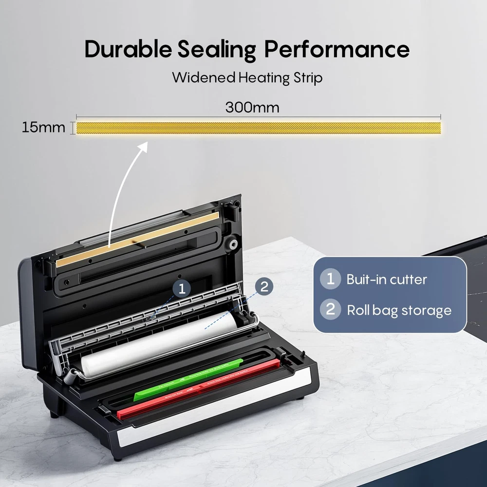 Automatic Food Vacuum Sealer Machine - designed to maximize freshness and minimize waste with ease! Experience effortless food preservation with our Food Sealer Vacuum Sealer, designed for both convenience and superior performance. This fully automated home or commercial vacuum sealer features smart humidity and bag detection, allowing you to seal various foods with ease. With dual sealing modes specifically designed for dry and moist foods, our vacuum bag sealer provides versatile options to keep your food fresh longer. Boasting a powerful 18L/min suction rate, this vacuum food storage machine can continuously seal up to 50 bags within just 20 minutes, ideal for bulk sealing. Custom-sized bags are easily made with the built-in roll storage and integrated cutter, allowing you to create the perfect fit for every item you seal. For easy and thorough cleaning, the kitchen vacuum sealer includes a removable, full-water-sensing vacuum display, ensuring no spills or mess remain inside the sealer. The added Pulse and External Vacuum functions offer extended usability for delicate items or larger storage bags! WHY CHOOSE AUTOMATIC BAG SEALER? Superior Quality Fully Automatic Operation Automatic Humidity Automatic Bag Detection Airtight Secure Seal Boosts High Suction Power of 18L/min Perfect for Big Meal-prepping Sessions Built-In Roll Storage & Cutter Removable Vacuum Chamber Full Water-Sensing Display Pulse & External Vacuum Functions Guaranteed Satisfaction PACKAGE INCLUDES 1 X Food Vacuum Seal Machine 1 X Foam Gasket 2 X Roll Bags (8" x 20' and 11" x 20') 1 X External Vacuum Accessories 1 X Manual So why wait? Add this wet dry vacuum sealer to your basket and start preserving your food effortlessly! 【Effortless Operation】'Vacuum & Seal' mode (no button needed): Place the bag opening under the Green baffle & close the lid; 'Seal' mode (no button needed): Red baffle & close the lid; 'Pulse' mode: Freely control the vacuum degree - ideal for easily - deformed food; 'External' mode: Vacuum jars, sous vide bags, containers or wine plug; Auto Locking system: One-handed lid opening & closing - no need for extra pressing 【Superior Performance/Inteligent Wet-Preservation】With powerful suction and exclusive sealing technology, our vacuum sealer effectively seals up to 50 bags continuously within 20 minutes. In automatic mode, the intelligent moisture lock technology allows the machine to seal immediately after detecting liquid, thereby better locking in the moisture of the ingredients 【Your Kitchen Essential】Made from food-grade materials, it is sturdy and durable, suitable for long-term use. It meets all your food storage needs, whether for dry foods, wet foods, marinated items, or storage containers.The wider heating strip provides a long-lasting seal, extending the storage time of food by up to 8 times 【Built-In Bag Cutter & Roll Storage】Our vacuum sealer has a built-in roll storage and can be used with the bag cutter to make plenty of pre-cut bags efficiently 【Fully Starter Kit】Includes food vacuum seal machine *1, foam gasket *1, rolls bags *2 (8” x 20’ & 11” x 20’), air suction hose * 1, external interface * 1, and user manual *1