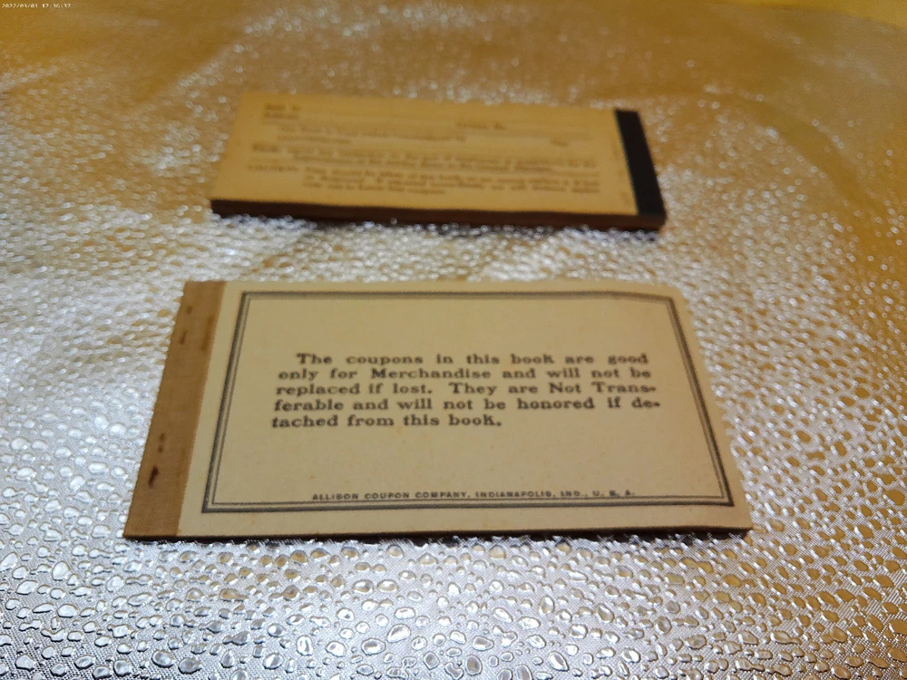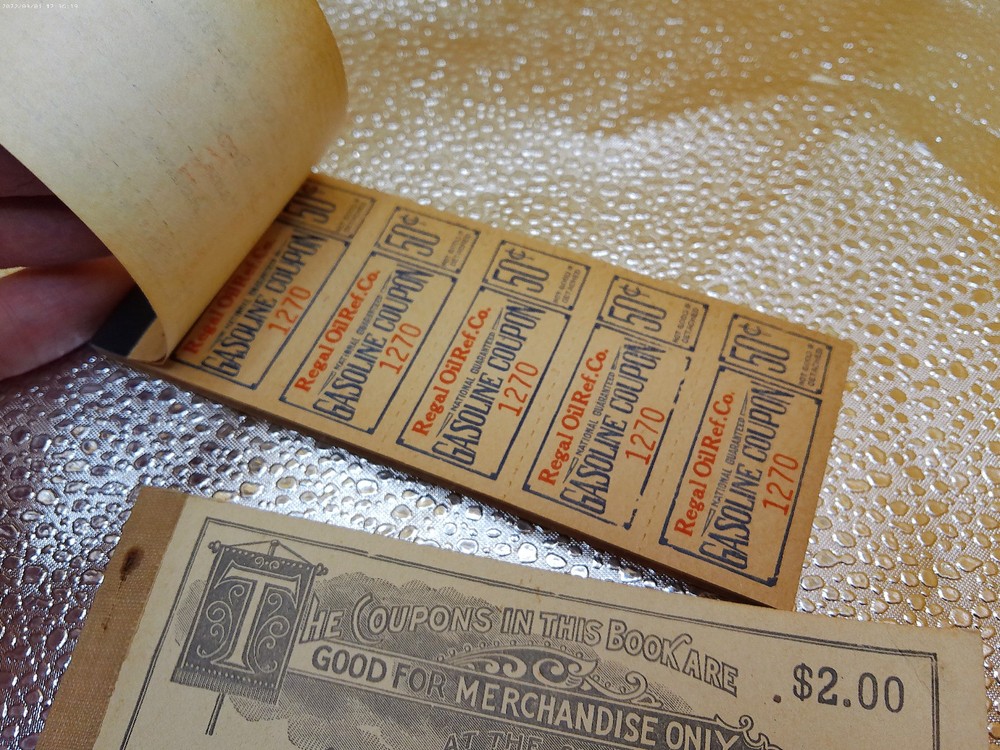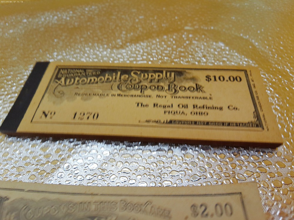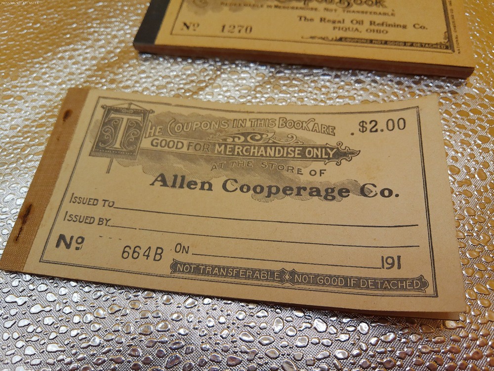 The product is a vintage automobile & merchandise coupon book from the 1920s era, featuring companies such as Allen Cooperage and Regal Oil of Piqua, Ohio. This collectible item likely contains various coupons and promotions related to automotive products and services from the era, providing a glimpse into the consumer culture and advertising tactics of the time. Perfect for collectors of vintage memorabilia or those interested in the history of the automotive industry, this lot of two coupon books offers a unique piece of ephemera from the 1920s.