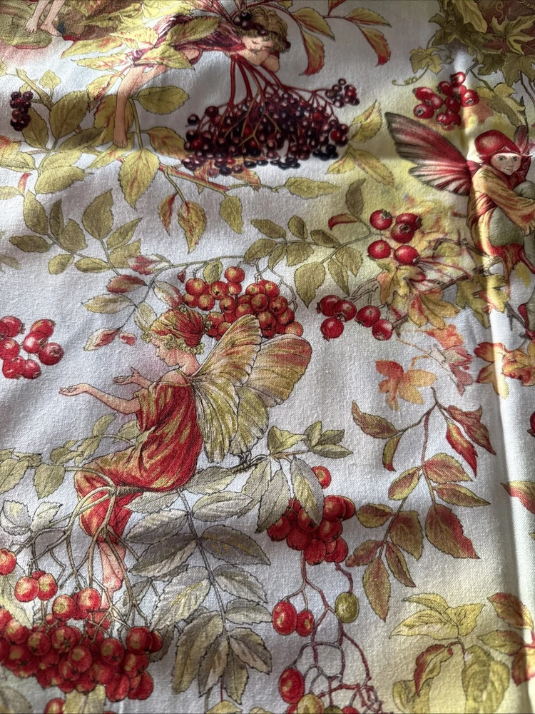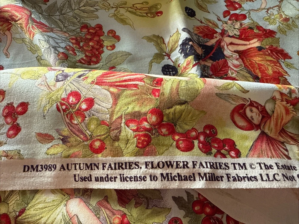 2008. Brand New DM 3989 Autumn Fairies FLOWER FAIRIES by Cicely Mary Barker -Michael Miller Fabrics this one piece fabric measures 42” wide x 37” long Very light lavender background with overall colorful fruits So pretty!! Excellent for any project See my other related items at auction now Can combine shipping