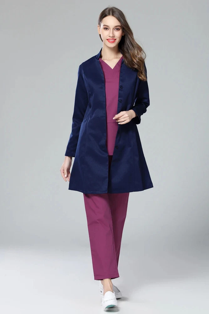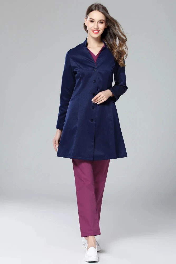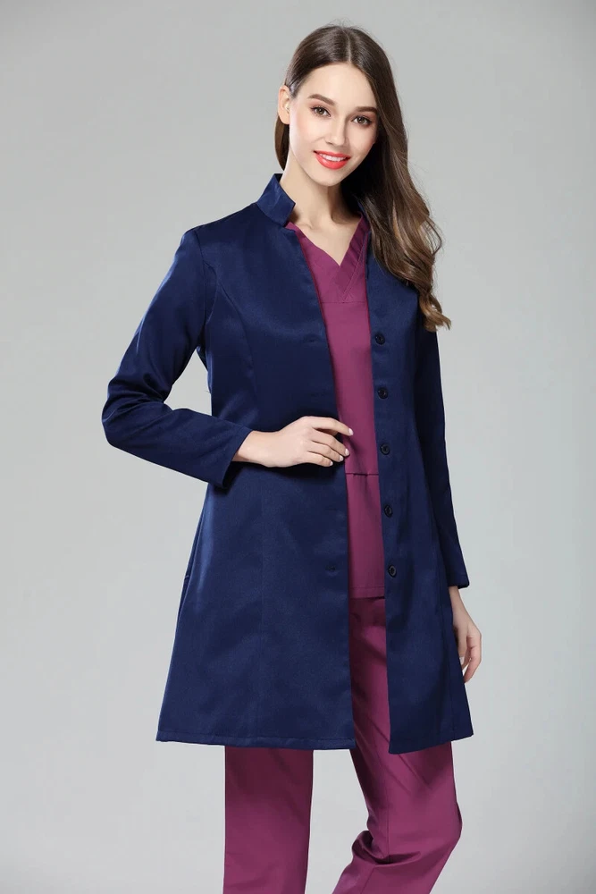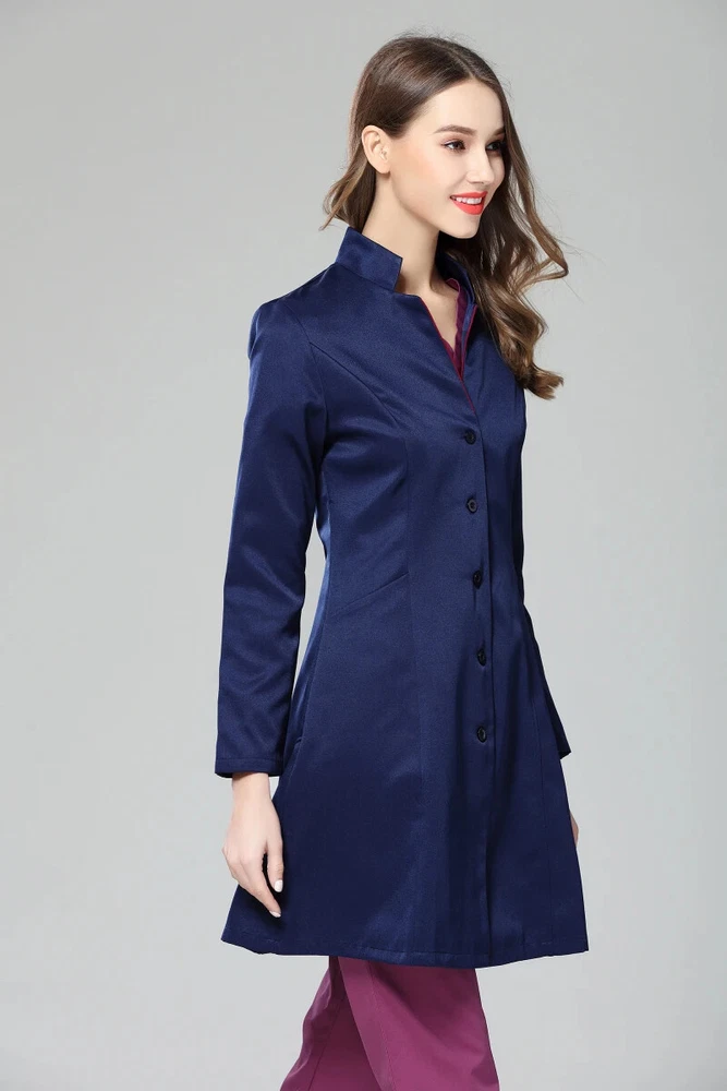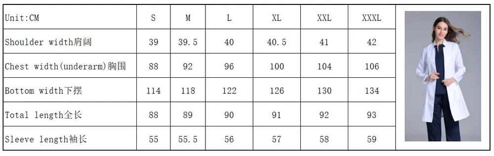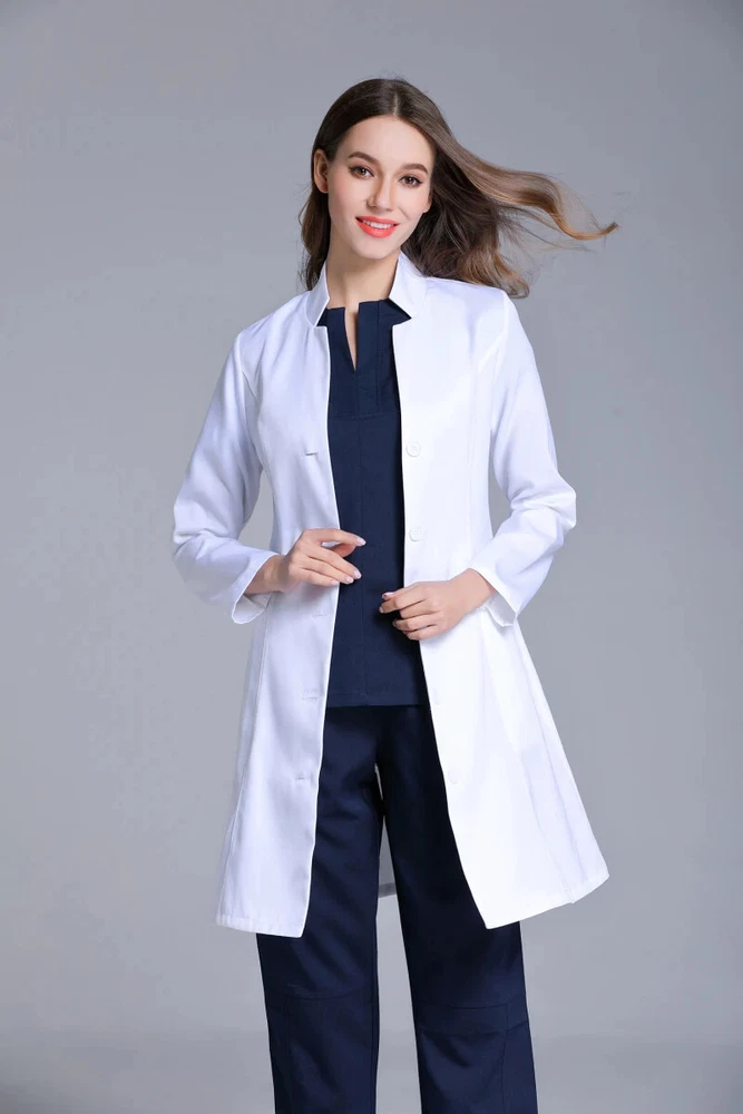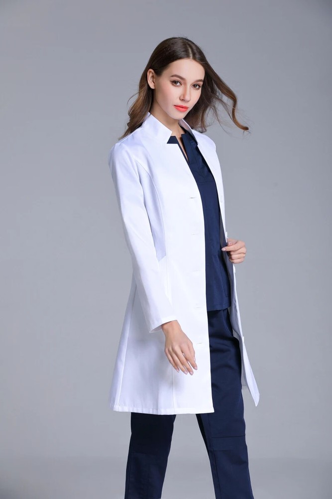 Product description Women white lab coat ,stand collar ,slim fit , high quality , anti wrinkle Application: widely used in medical shcool ,hospital,dental clinic Color: white,dark navy Material: 65/35 polyester/cotton twill Inner Lining: no inner lining Applied seasons: All seasons Features: 1) washable 2) Good quality and sewing 3) White collar 4) Princess seam to keep fit slim Uniform size spec as below : (Model 175CM 48KGS , bust/waist/hip=84/61/84CM , wearing size "S") Uniform is Asia size slim fit . Buyer need buyer one size larger than normal. Uniform size spec ad below : Model wearing appearance : White: Dark navy(new color):