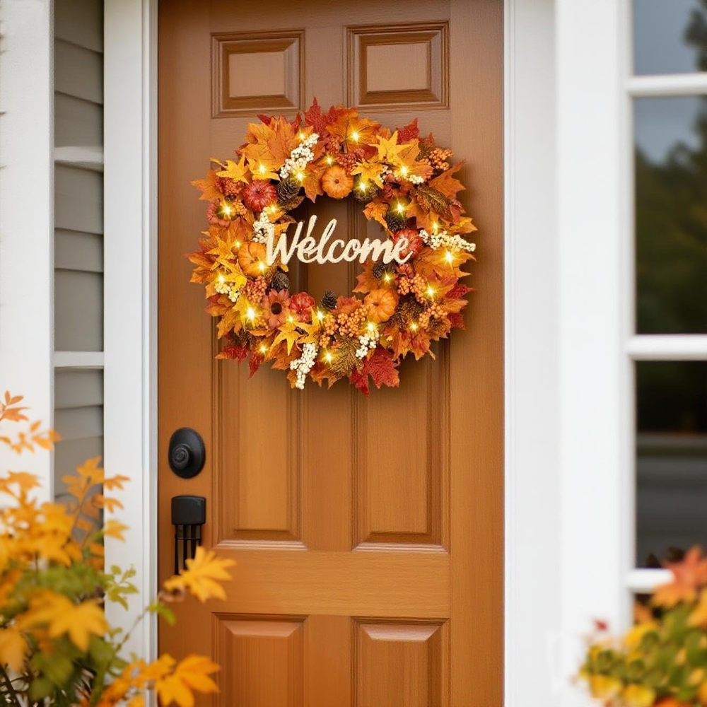 Autumn Wreath with Lights for Front Door - Fall Welcome Decor