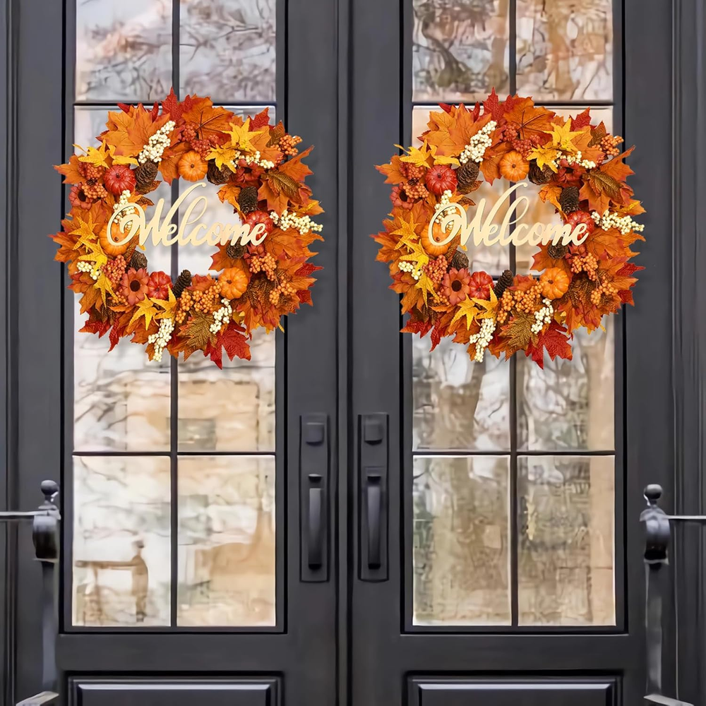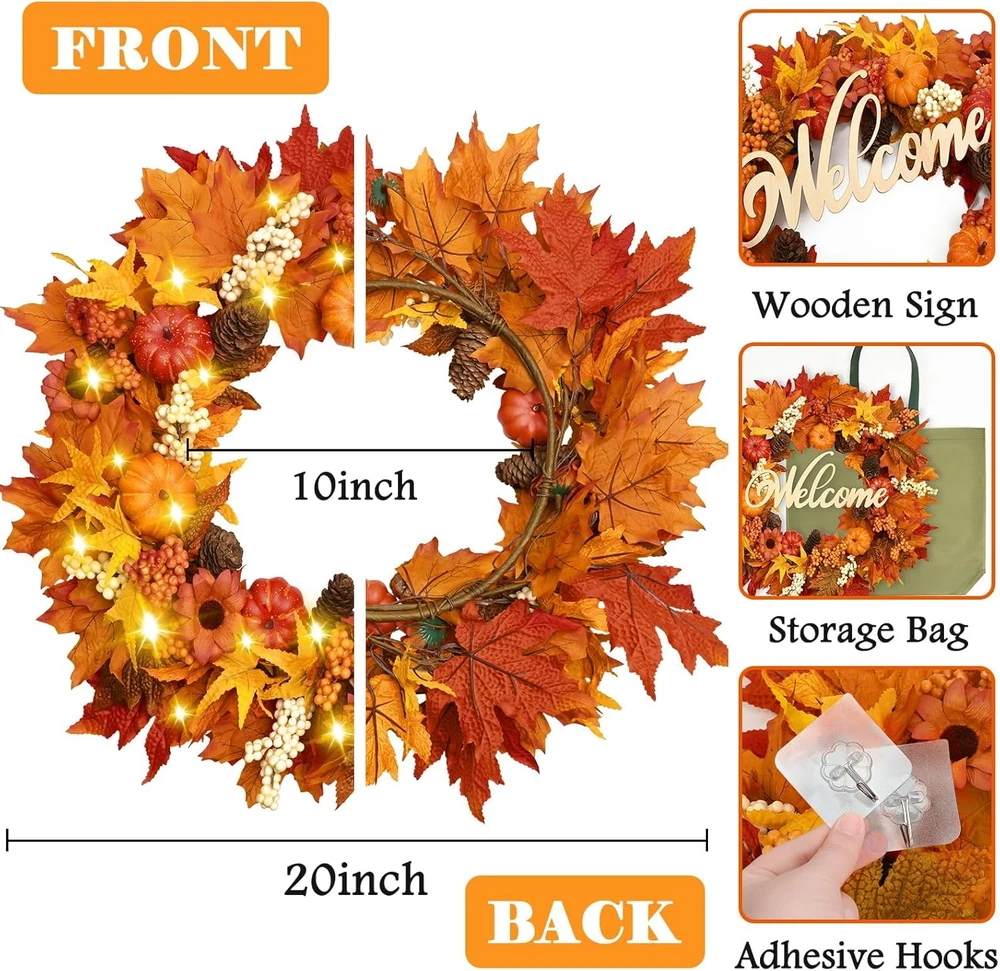 🍁BOUNTIFUL FALL DESIGN: With a mix of vibrant fall colors, such as deep reds, oranges, and yellows, our autumn wreath instantly bring a touch of warmth and coziness to any space. The carefully selected pumpkins, foliage, and white berries create a visually appealing arrangement that captures the spirit of autumn. 🍁TIMER FUNCTION: The battery box features a 6-hour on/18-hour off timer function, allowing for energy-saving operation. This lighted Christmas garland is battery operated. Simply insert 3 AA batteries and enjoy worry-free decorations that automatically illuminate at the same time every day. Add ease and efficiency to your holiday preparations. 🍁WARM LIGHTS & WELCOME SIGN: Each front door wreath comes with a welcome wooden sign. These accessories are all detachable and perfectly complement the wreath design, enhancing its visual appeal. Additionally, we provide a convenient storage bag to protect the wreath from dust when not in use, ensuring it remains in pristine condition. 🍁PERFECT GIFT CHOICE: Looking for a unique and thoughtful gift? Our lighted wreaths are the perfect choice. They make a delightful present for housewarmings, birthdays, anniversaries, or any special occasion. The wreath with lights add a festive and welcoming touch to any home, making them a memorable gift. 🍁VERSATILE DÉCOR: Our orange wreaths are perfect for any occasion. They can be easily hung on doors, walls, or mantels to create a stunning focal point. They can also be draped along tables, used as a centerpiece, or wrapped around staircases, adding an elegant and charming touch to any event or celebration. 🍁NOTICE: All the accessories are disassembled and need to be installed manually. Product Description Wooden Welcome Sign Wooden sign is made of natural wood, which has smooth surface, durable and lightweight. Perfect as a door decoration. 30 × LED Lights The fairy lights are made of a soft silver wire. Features a 6-hour on/18-hour off timer function, allowing for energy-saving operation. Storage Bag Protect sunflower wreath from dust when not in use, ensuring it remains in pristine condition. Applicable to Various Scenarios Wall Decor Stairway Decor Window Decor