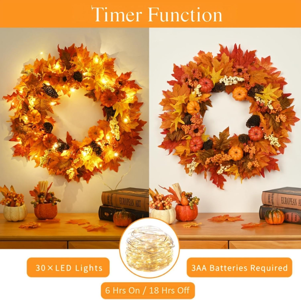 1. This wreath is absolutely stunning—it brings instant autumn charm to my front door! The rich, warm colors and beautiful mix of pumpkins, leaves, and berries make it so inviting. I love the built-in timer for the lights—it saves energy while keeping my porch cozy and welcoming. The battery operation is super convenient, and the quality is fantastic. It’s the perfect seasonal touch that gets compliments from everyone who passes by!