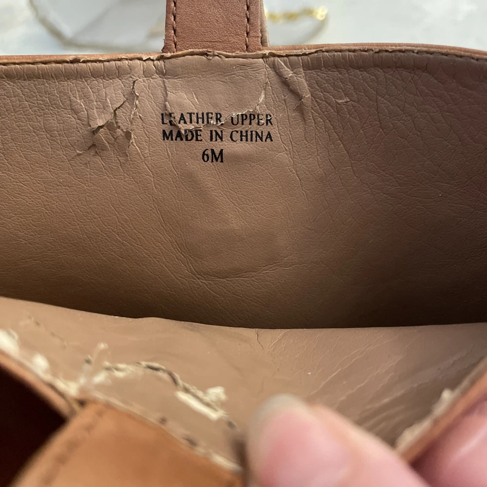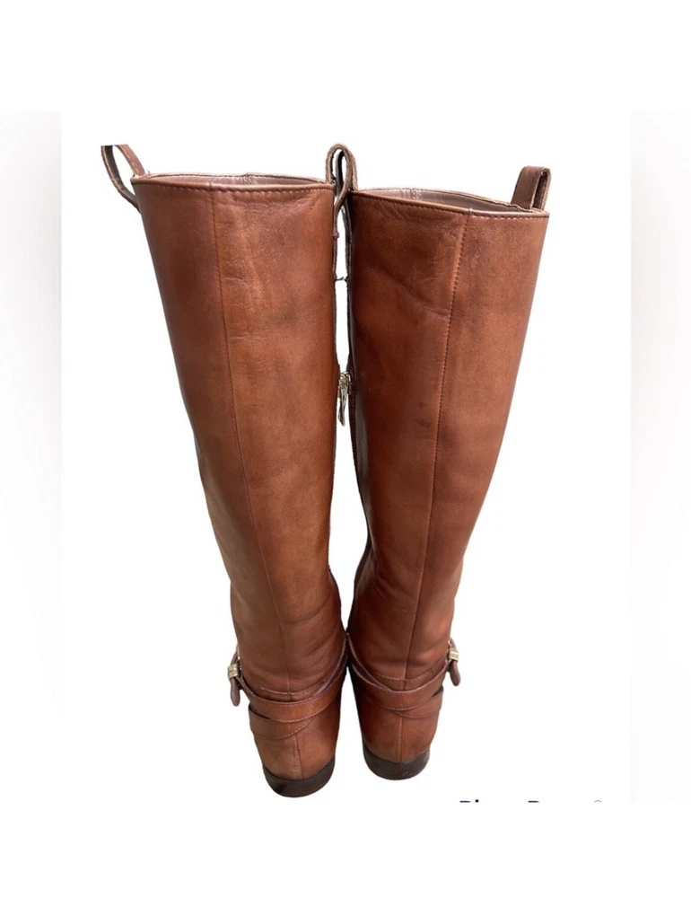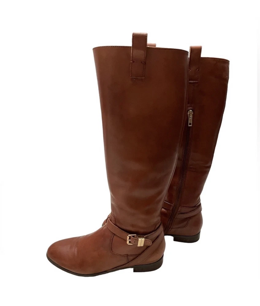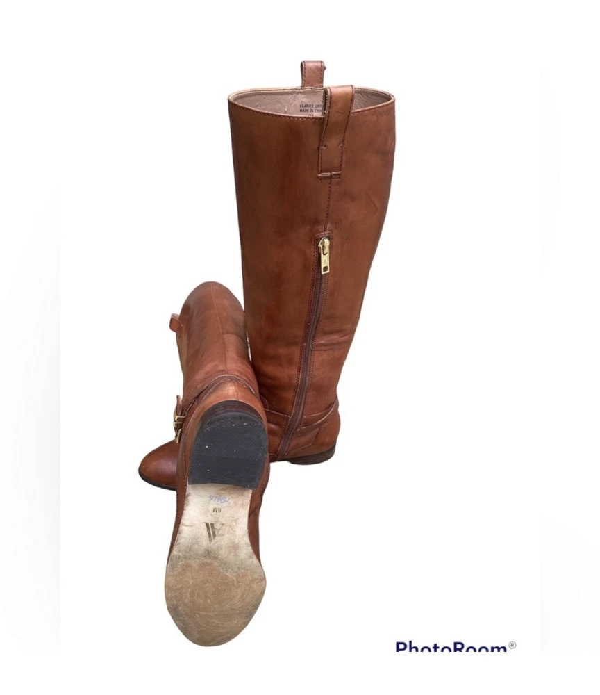 Ava & Aiden All Leather Brown Zippered Knee High Fashion Riding Boots Sz 6 Step out in style with these Ava & Aiden knee-high boots. The classic riding boot design features a rich chestnut brown leather upper with an almond toe shape and flat heel. The side zipper and buckle strap accents add a touch of edginess and make them easy to slip on and off. Perfect for any occasion, whether you're dressing up for a party, staying casual for a day out, or dressing for work, these boots are a versatile addition to any wardrobe. The arch support and ankle strap make them comfortable for all-day wear, while the leather upper provides durability. Available in women's size 6. Note wear on the inner lining. This does not show and does not affect wearability of the boot. See photos.