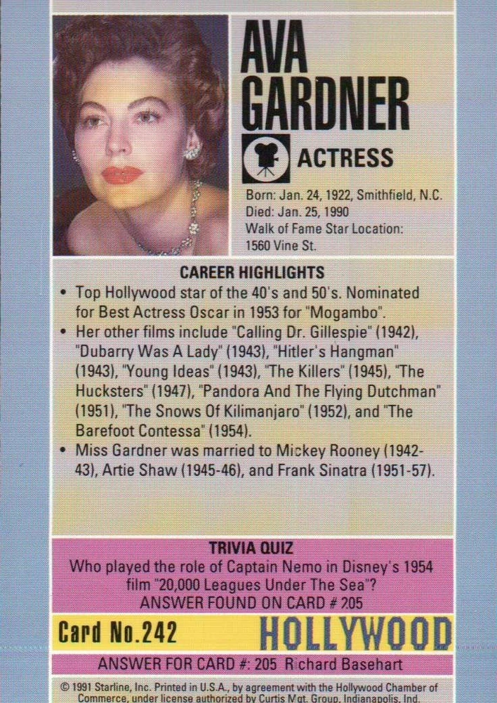Hi, thanks for looking !!! This Trading Card is in nice shape ( Please note this is a trading card, not a postcard ) !!! This card measures about 3 1/2 " x 2 1/2 ". Please see both scans, the terrific picture on the front, and the great information on the back !!! YES, I COMBINE SHIPPING !!! Buy as many cards as you would like and pay a shipping charge of just 99 cents ( US addresses ). PLEASE, CHECK OUT MY STORE !!! Have a Wonderful Day !!! Please note that in some cases wavy, multi-colored lines ( banding ) appear on the scanned image. These lines do not appear on the actual card !!! Hollywood Trading Cards ( Green ) 242 - 93013