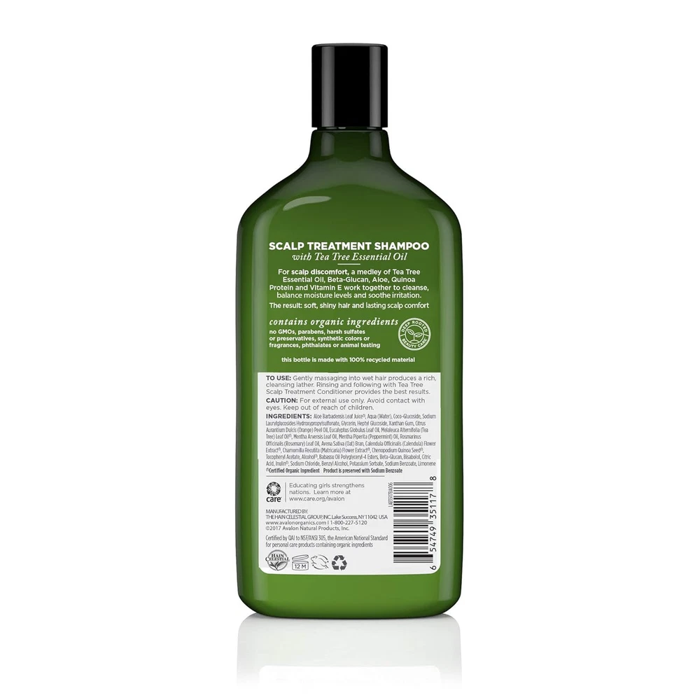 Avalon Organics Scalp Hair Treatment Shampoo Tea Tree, 11 oz (6 Pack) Avalon Organics Scalp Treatment Tea Tree Shampoo. Made with plant-sourced botanicals and essential oils, this certified organic formula balances moisture levels and soothes irritation. Tea tree essential oil, beta-glucan, aloe, quinoa protein and vitamin E work together to condition and seal the hair cuticle for strong, shiny hair and lasting scalp comfort. About this item Scalp Treatment: This shampoo cleanses hair and scalp while encouraging scalp well-being. It leaves hair soft and healthy-looking Thoughtfully Made: Comprised with a medley of Tea Tree Essential Oil, Beta-Glucan, Aloe, Quinoa Protein, and Vitamin E, our signature botanicals are carefully curated to help your hair thrive Formulated Without: This shampoo is packaged in a 100% recycled bottle and is formulated without parabens, sodium laureth sulfate, synthetic colors, or synthetic fragrances Certifications: All our products are cruelty-free and Leaping Bunny Certified, providing assurance of no animal testing. This shampoo is NSF Certified as a personal care product containing organic ingredients EWG Verified: The Environmental Working Group VERIFIED mark on a product confirms it's free from EWG's chemicals of concern and meets the EWG’s strictest standards for your wellbeing No GMOS, parabens, sulfates, synthetic colors or fragrances, phthalates, or animal testing NSF certified Biodegradable Adult Use Ingredients Aloe Barbadensis Leaf Juice, Water (Aqua), Sodium Coco-sulfate, Sodium Laurylglucosides Hydroxypropylsulfonate, Decyl Glucoside, Citrus Aurantium Dulcis (Orange) Peel Oil, Eucalyptus Globulus Leaf Oil, Melaleuca Alternifolia (Tea Tree) Leaf Oil, Mentha Arvensis Leaf Oil, Mentha Piperita (Peppermint) Oil, Rosmarinus Officinalis (Rosemary) Leaf Oil, Avena Sativa (Oat) Bran, Calendula Officinalis Flower Extract, Chamomilla Recutita (Matricaria) Flower Extract, Chenopodium Quinoa Seed, Tocopheryl Acetate, Babassu Oil Polyglyceryl-4 Esters, Beta-glucan, Bisabolol, Citric Acid, Coco-glucoside, Glyceryl Oleate, Inulin, Sodium Chloride, Sodium Phytate, Sodium Sulfate, Alcohol, Benzyl Alcohol, Potassium Sorbate, Sodium Benzoate, Limonene