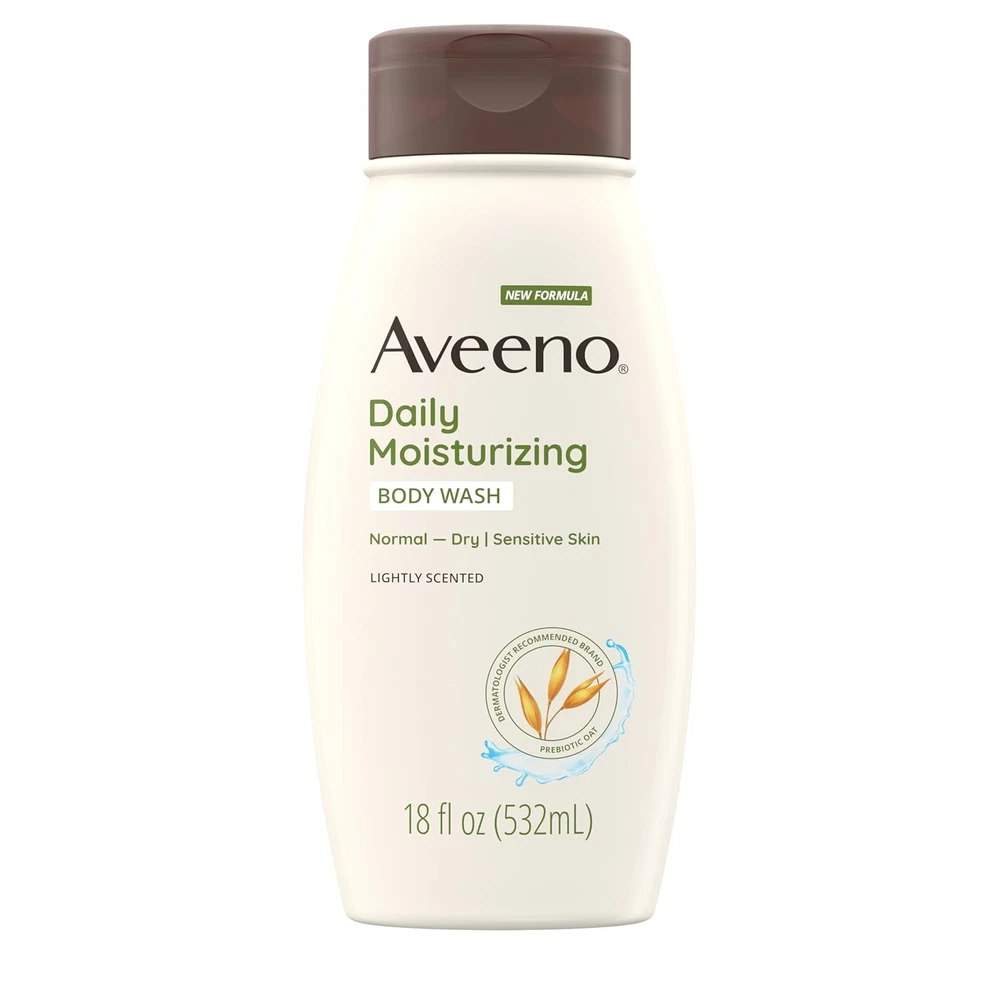 33-fluid ounce bottle of Aveeno Daily Moisturizing Sulfate-Free Body Wash with prebiotic oat and a light scent to nourish and gently cleanse dry skin to help preserve skin's natural moisture barrier Aveeno's unique formula combines prebiotic oat to help lock in moisture and gently cleanses to reveal smoother, softer skin long after you shower. 92% of users agreed this daily cleanser left their skin feeling nourished while they showered The daily cleanser is formulated for sensitive skin and features a light fragrance designed to be gentle on skin. The nourishing shower wash is allergy tested and free of sulfates, parabens, dye and soap Use this moisturizing body wash for dry skin with Aveeno Daily Moisturizing Body Lotion to lock in moisture for 24 hours. The creamy wash can also be used as a rich shave gel for silky, smooth legs Aveeno, a dermatologist recommended brand for over 70 years, has set a goal to have 100% recyclable, reusable or compostable packaging by 2025. We've relied on nature for generations. Now we're protecting its future Aveeno Daily Moisturizing Body Wash with soothing prebiotic oat and a light scent nourishes dry skin. This creamy body wash gently cleanses and helps preserve skin's natural moisture barrier. 92% of users agreed that the cleanser left their skin feeling nourished while they showered. Aveeno Daily Moisturizing Body Wash has an allergy tested formula that contains nourishing oat to help lock in moisture and gently cleanse sensitive, dry skin to reveal smoother, softer skin. From the Dermatologist-recommended brand for over 70 years, this Aveeno body wash for sensitive skin is a lightly scented body wash that is formulated to be free of sulfates, parabens, dyes and soaps and will leave skin feeling moisturized. To use, squeeze this oat body wash onto a wet washcloth or hands, work into a rich, creamy lather and rinse. The creamy body wash can also be used as a rich shave gel for silky, smooth legs. Follow with Aveeno Daily Moisturizing Body Lotion to lock in moisture for 24 hours.
