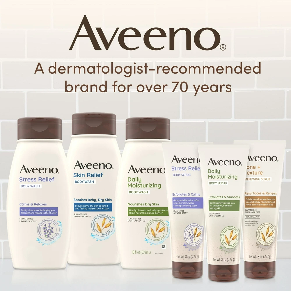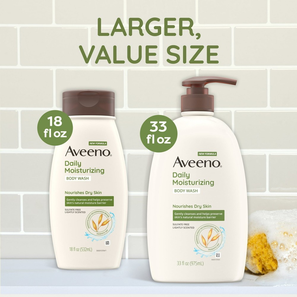 About this item Product details Aveeno Daily Moisturizing Body Wash with soothing prebiotic oat and a light scent nourishes dry skin. This creamy body wash gently cleanses and helps preserve skin's natural moisture barrier. 92% of users agreed that the nourishing cleanser left their skin feeling nourished while they showered. The allergy tested formula of the sulfate-free body wash contains nourishing oat to help lock in moisture, and gently cleanses dry, sensitive skin to reveal smoother, softer skin long after you shower. From the Dermatologist-recommended brand for over 70 years, this moisturizing body cleanser for sensitive skin from Aveeno is lightly scented, and formulated to be free of sulfates, parabens, dyes and soaps. To use, squeeze body wash onto a wet washcloth or hands, work into a rich, creamy lather, and rinse. Creamy body wash can also be used as a rich shave gel for silky, smooth legs. Follow with Aveeno Daily Moisturizing Body Lotion to lock in moisture for 24 hours.*Two moisturizing oat formulas Aveeno Daily Moisturizing Body Wash for dry skin with soothing prebiotic oat to nourish skin Daily shower body wash formula gently cleanses & helps preserve skin's natural moisture barrier Lightly scented cleanser contains nourishing oat to help lock in moisture & gently cleanses dry skin Sulfate-free body wash with prebiotic oat reveals smoother, softer skin long after you shower 92% of users agree that moisturizing bath wash left their skin feeling nourished while they showered Cleanser is suitable for sensitive skin, lightly scented & free of sulfates, parabens, dyes & soaps After cleansing, follow with Aveeno Daily Moisturizing Body Lotion to lock in moisture for 24 hours The Aveeno brand's goal is to have 100% recyclable, reusable or compostable packaging by 2025