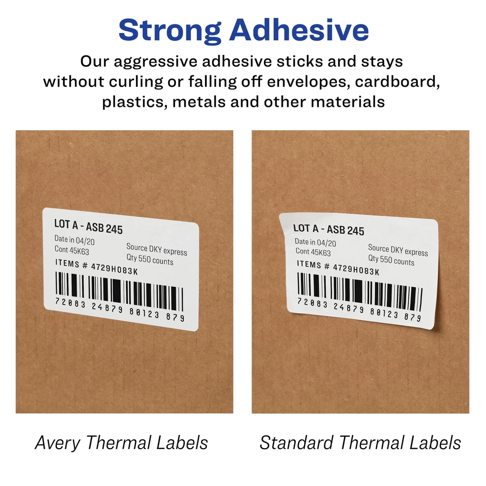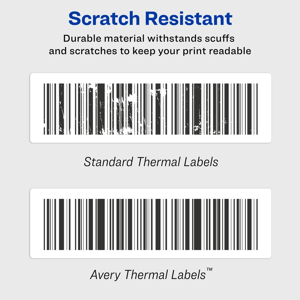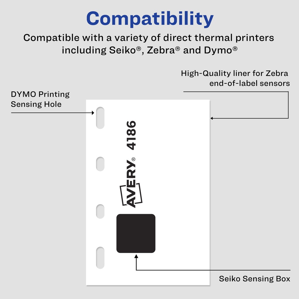 Ideal for the home or office, BPA-free Avery 4186 thermal printer labels are the right labels for any job. These multi-use labels are resistant to smudges, scratches, water and grease, making them perfect for a wide variety of labeling projects. The label rolls are also compatible with a variety of direct thermal printers including DYMO printers, Zebra printers and Seiko printers. Each thermal label roll is safely sealed in a protective bag to protect the sensitive label material from light and heat. A use-by date is also included to help guarantee the best results. The bright, white label material helps your print stand out to ensure that your text is clear and readable. Direct thermal labels don't require ink or toner and are ideal for offices or businesses that need labels on demand. Avery thermal labels are available in multiple sizes to fit any label need. Whether you need business labels, file labels, mailing labels, shipping labels, rack labels or more, there's an Avery label that will solve your problems. Compatible with a variety of direct thermal printers including DYMO(R), Seiko(R) and Zebra(R); label comparable to DYMO 30334 Water resistant label material also resists scratches, smudges and grease staying legible through any labeling project Individually bagged to protect light-sensitive thermal label material BPA-free permanent adhesive labels stick and stay on a variety of surfaces such as envelopes, cardboard, plastic and metal Print high-volume labels or just one at a time to instantly create barcode labels, address labels, inventory labels, ID labels and more Bright white label material provides contrast to help text stand out 1,000 multipurpose labels per roll