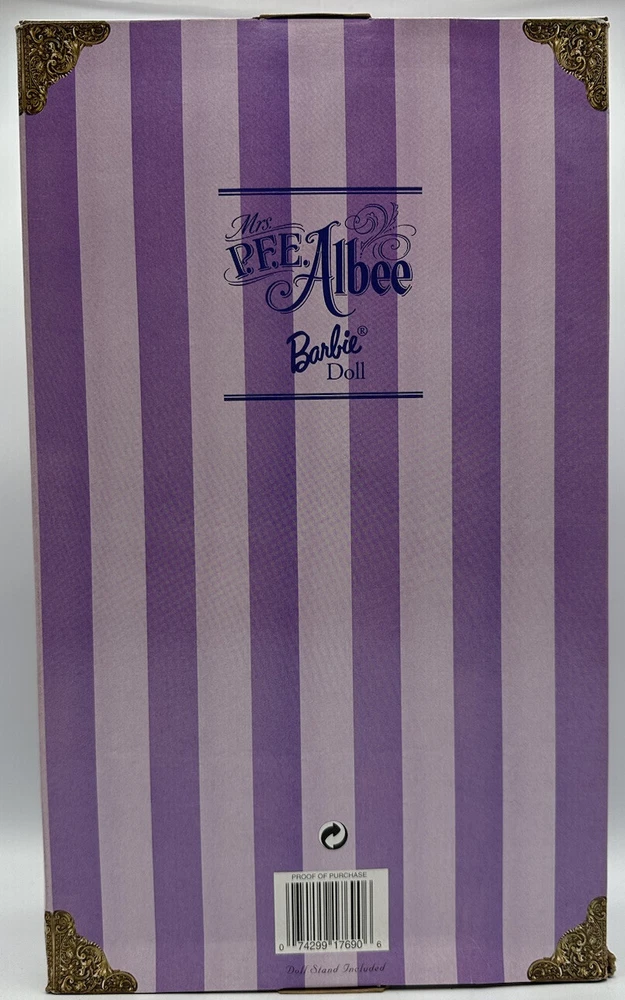 Introducing the Avon Barbie as P.F.E. Albee, the first in a special edition vintage series from 1997. This 11.5" girl doll features black hair and blue eyes, and comes dressed in a skirt, jacket, jabot, hat, shoes, and panties, along with a jewelry brochure, doll stand, and all in the original (opened) packaging. The doll is made of plastic and is recommended for ages over 14. This special edition fashion doll is a must-have for collectors and fans of the Avon franchise. It's perfect for all occasions and is sure to make a great addition to any doll collection. So don't miss out on the chance to own this unique and rare piece from 1997!
