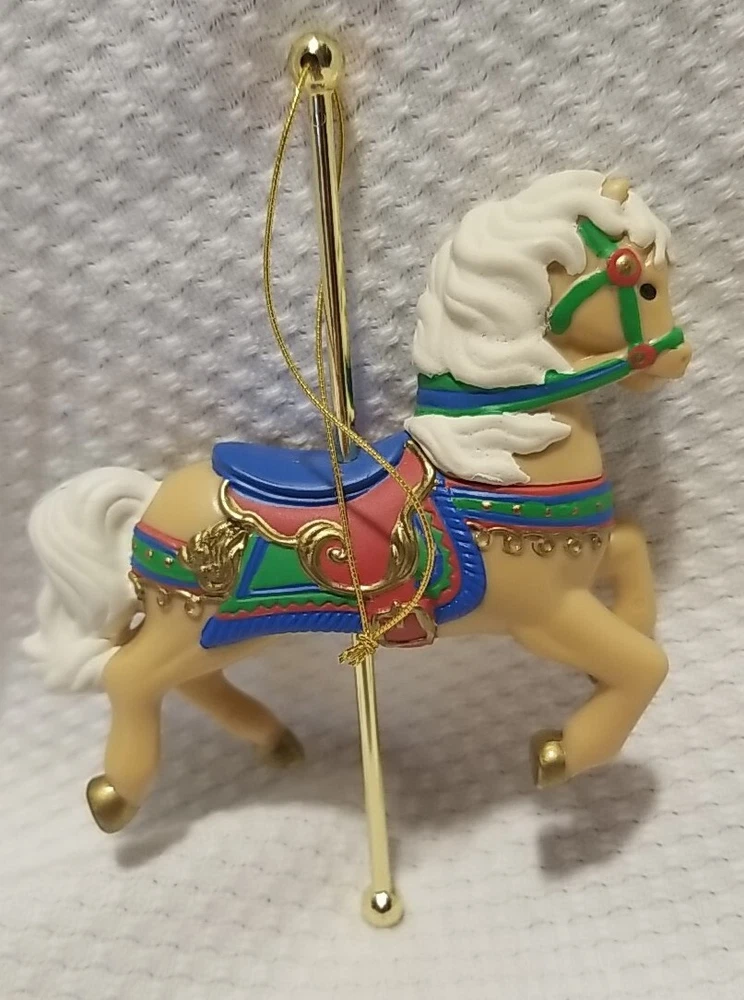 Add a touch of exotic elegance to your Christmas decor with this beautiful Avon Gift Collection Christmas Ornament Carousel. This small, multicolored plastic ornament features a horse from a carousel, perfect for any animal-themed Christmas tree. The ornament is part of the Avon brand and comes with a hanging feature for easy placement. This Christmas ornament is perfect for adults and is sure to add a unique touch to your holiday decor. The geometric pattern and intricate design of the horse make it a true standout. Celebrate the holiday season in style with this exquisite Avon Gift Collection Christmas Ornament Carousel. Nice vintage condition
