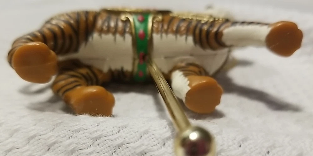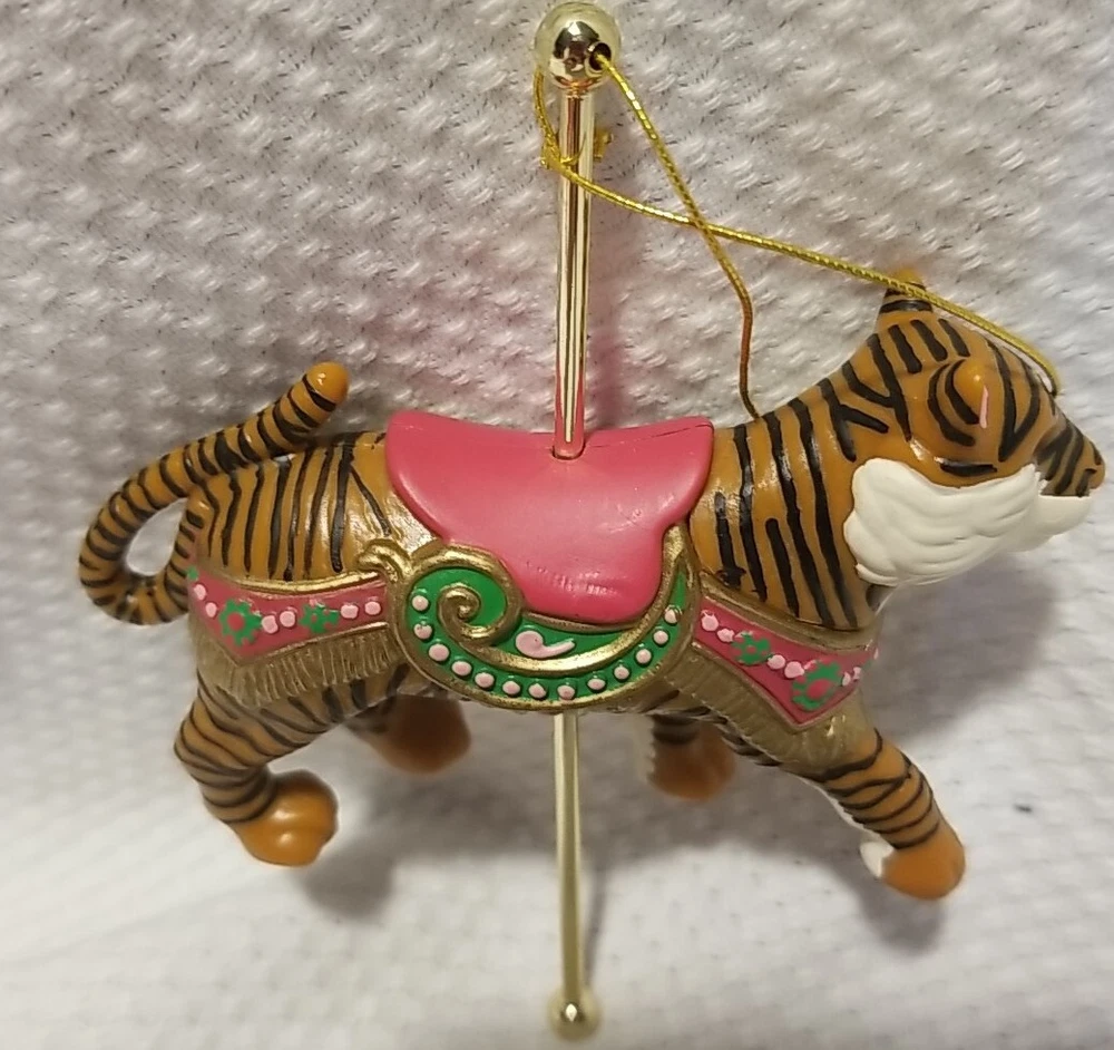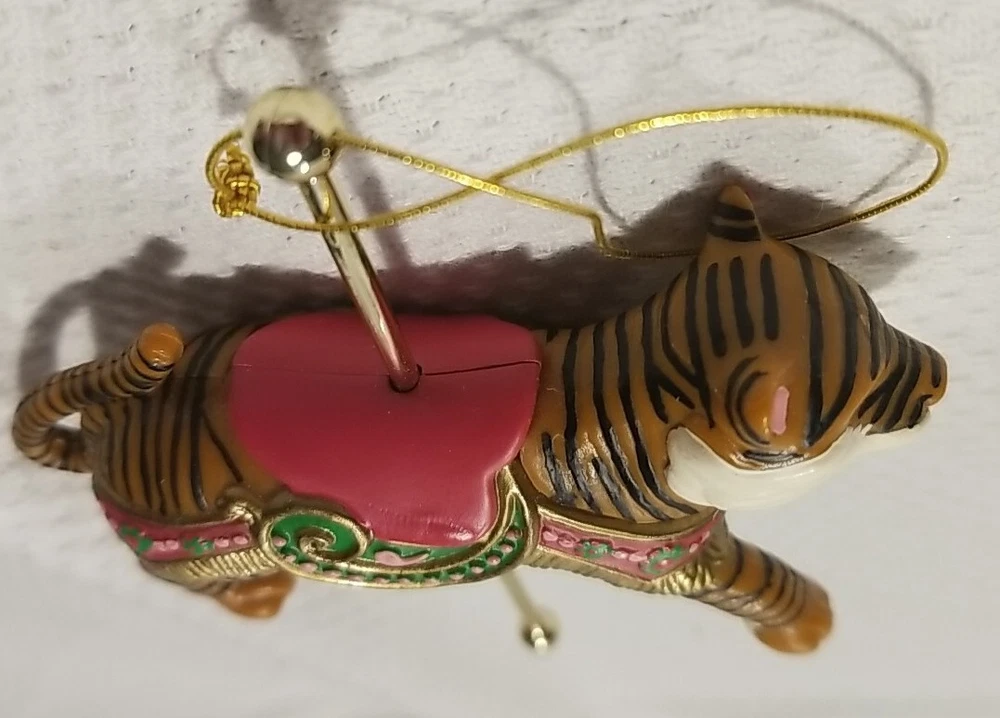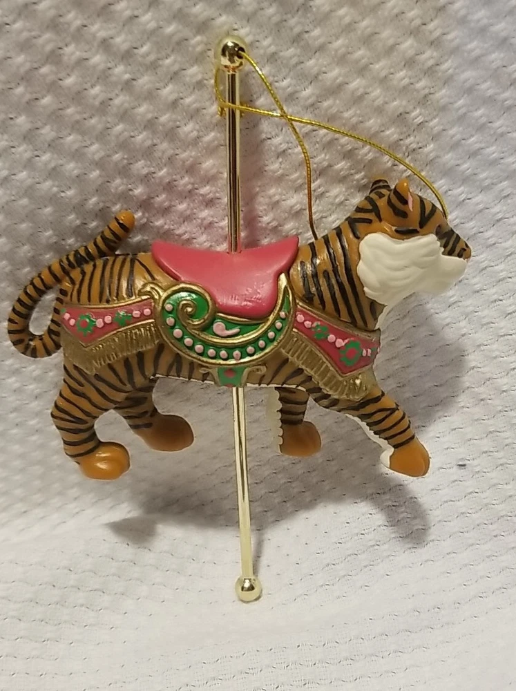 This Avon Gift Collection Christmas Ornament Carousel features a beautiful exotictiger design that is perfect for adding a touch of wildness to your holiday decor. Made of durable plastic and measuring small in size, this hanging ornament is sure to catch your eye and add a unique touch to your Christmas tree. The multicolor geometric pattern and animal theme make it a great addition to any Christmas decor collection. Whether you're an animal lover or simply looking for a unique decoration, this Avon tiger ornament is sure to impress. Nice vintage condition