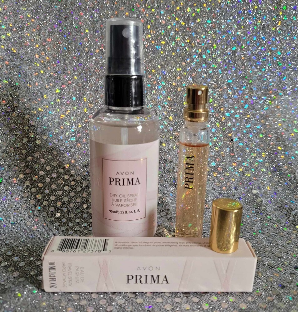 Avon PRIMA Perfume Spray & Dry Oil Body Spray ~ NEW ~ 3.25oz ~ NEXT DAY SHIPPING ~ Photos shown are the exact items you will receive in your order. Body Spray is SEALED & Perfume Spray is in new cond. in box About this Moisturizing Dry Oil Body Spray: Spritz your way to soft and smooth skin with this nourishing, lightweight oil featuring the elegant and dreamy scent of Avon Prima Eau de Parfum. Non-greasy formula! FRAGRANCE NOTES OF PERFUME & Body Spray: • Top: Delicate plum • Middle: Pink rose • Base: White patchouli FRAGRANCE CATEGORY Amber Floral Prima Eau de Parfum is an elegant embodiment of strength and grace. Warm and dreamy notes twirl together effortlessly to create a delicate, feminine and quietly powerful NOTES: • Top: Delicate plum • Middle: Pink rose • Dry: White patchouli Fragrance Category: Warm & Dreamy – Warm floral scents with flowing, silky and romantic notes. About Us: We have hundreds of items listed & in stock. We have access to many discontinued & hard-to-find items. If there is a particular discontinued or current item you need, just message us through eBay & we will try to help. We are happy to combine ship for you. All of our listed items come from a smoke-free/pet-free home. Our items have NEVER been exposed to extreme temperatures or direct sunlight that may alter their quality. All our items are well packed in boxes & stored. Next business day shipping. You will receive your item in great condition as we pack very carefully for shipment. We are in no way affiliated with AVON Company LLC or AVON Representatives. LOTS more hard-to-find items available. Click the OTHER ITEMS BLUE BUTTON below to see all our listings