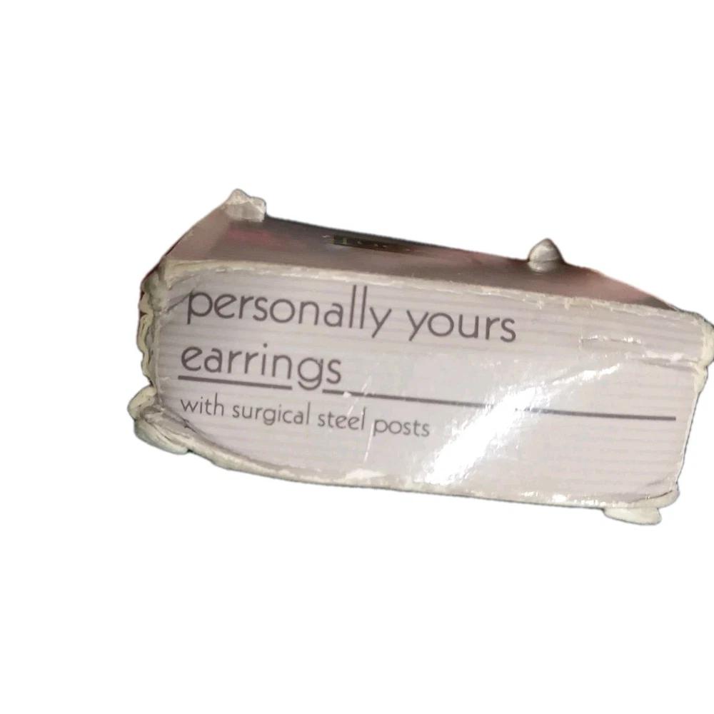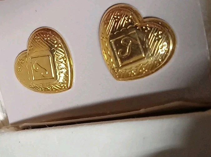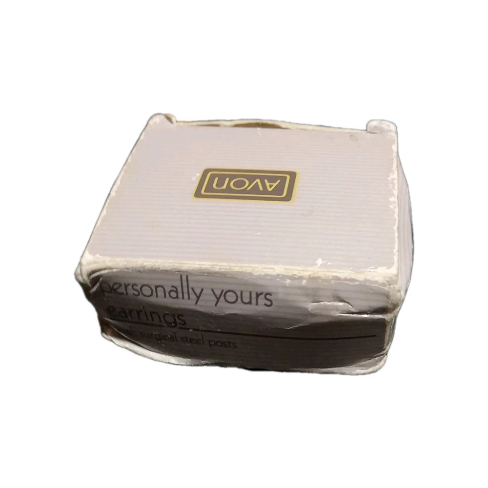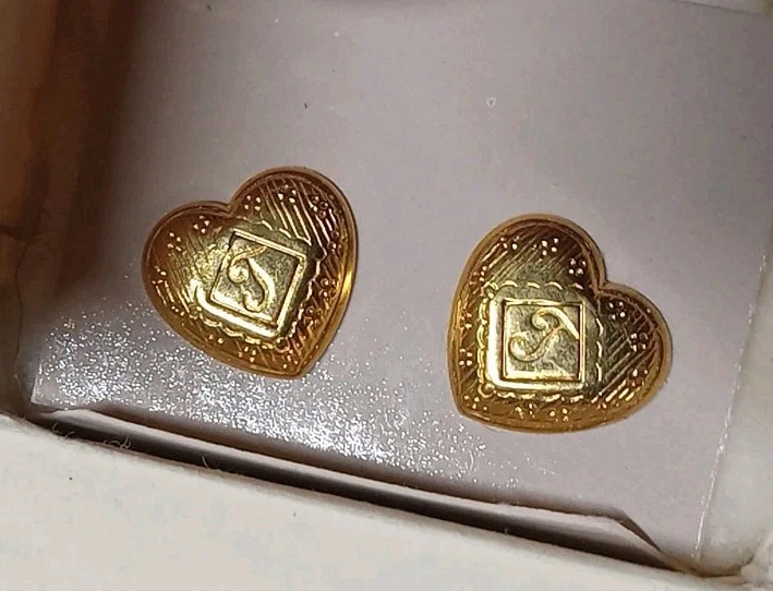 These Avon earrings feature a heart-shaped design with the letter "J" inside, made of gold-toned metal with surgical steel closure. They are suitable for various occasions like Mother's Day, Christmas, and birthdays. The earrings have a stud style and are designed for the earlobe. The personalized touch adds a sentimental value, making them a perfect gift choice. LOOK AT PHOTOS, BOX IS REALLY SQUISHED!