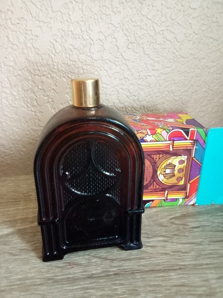 The Avon Spicy Aftershave Remember When radio decanter from 1972-73 is a vintage collectible in its original box. This asymmetrical bottle features a nostalgic radio theme, perfect for collectors of American vintage items. Made of glass and plastic, the medium-sized decanter in brown color showcases a retro design that would make a great addition to any collection or display. With a shiny finish and a unique all-occasion appeal, this Avon decanter is a charming piece of nostalgia from the 1970s. empty bottle in box