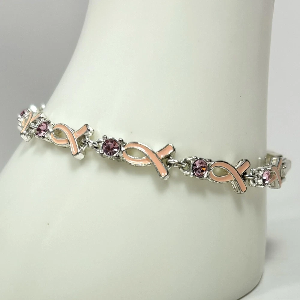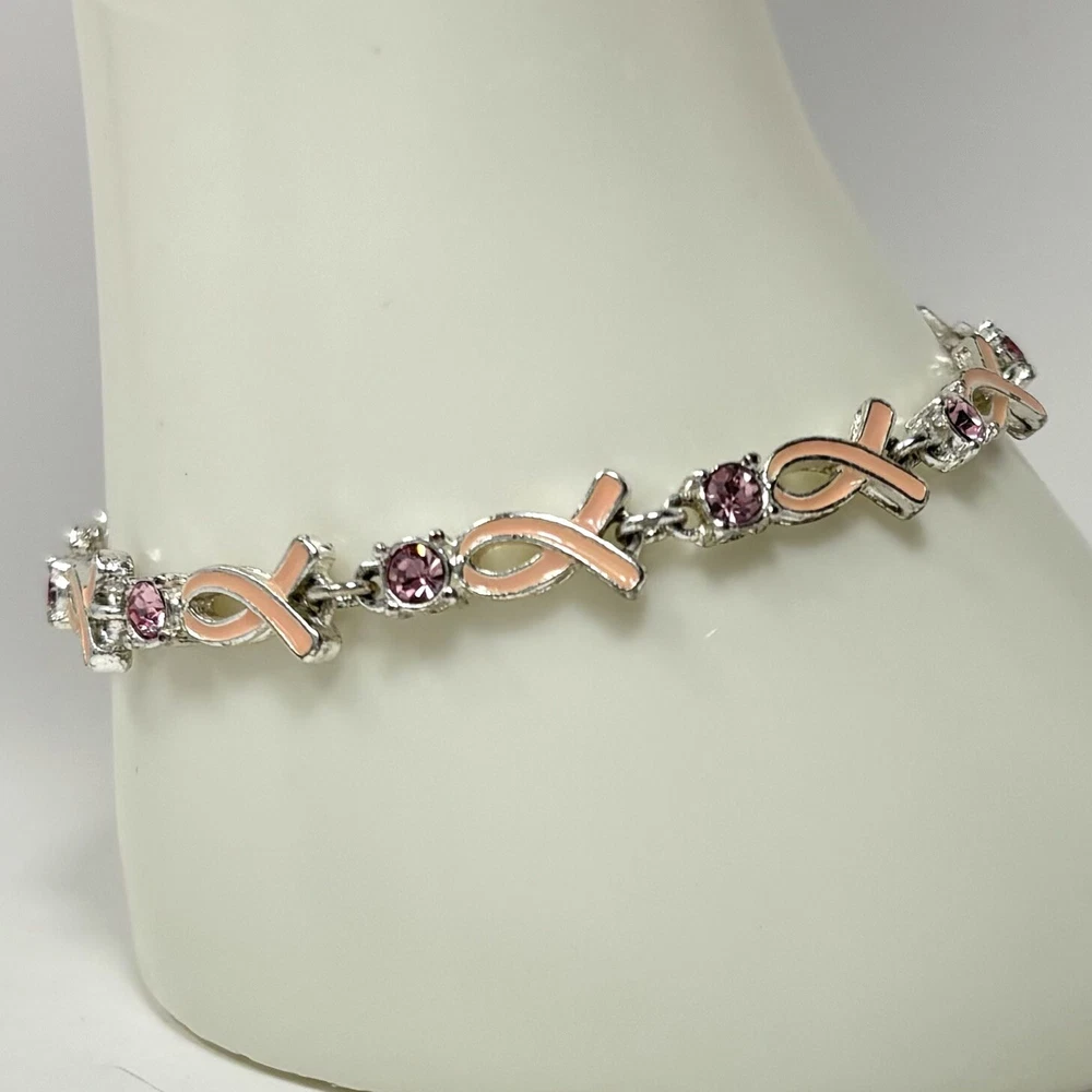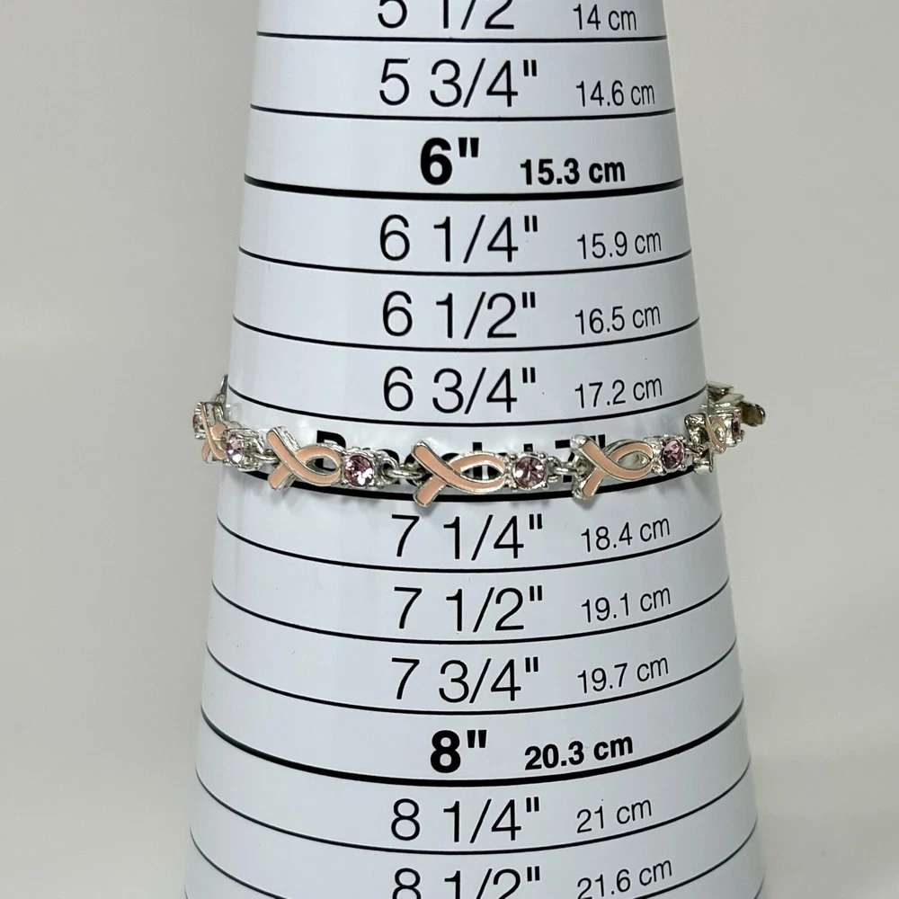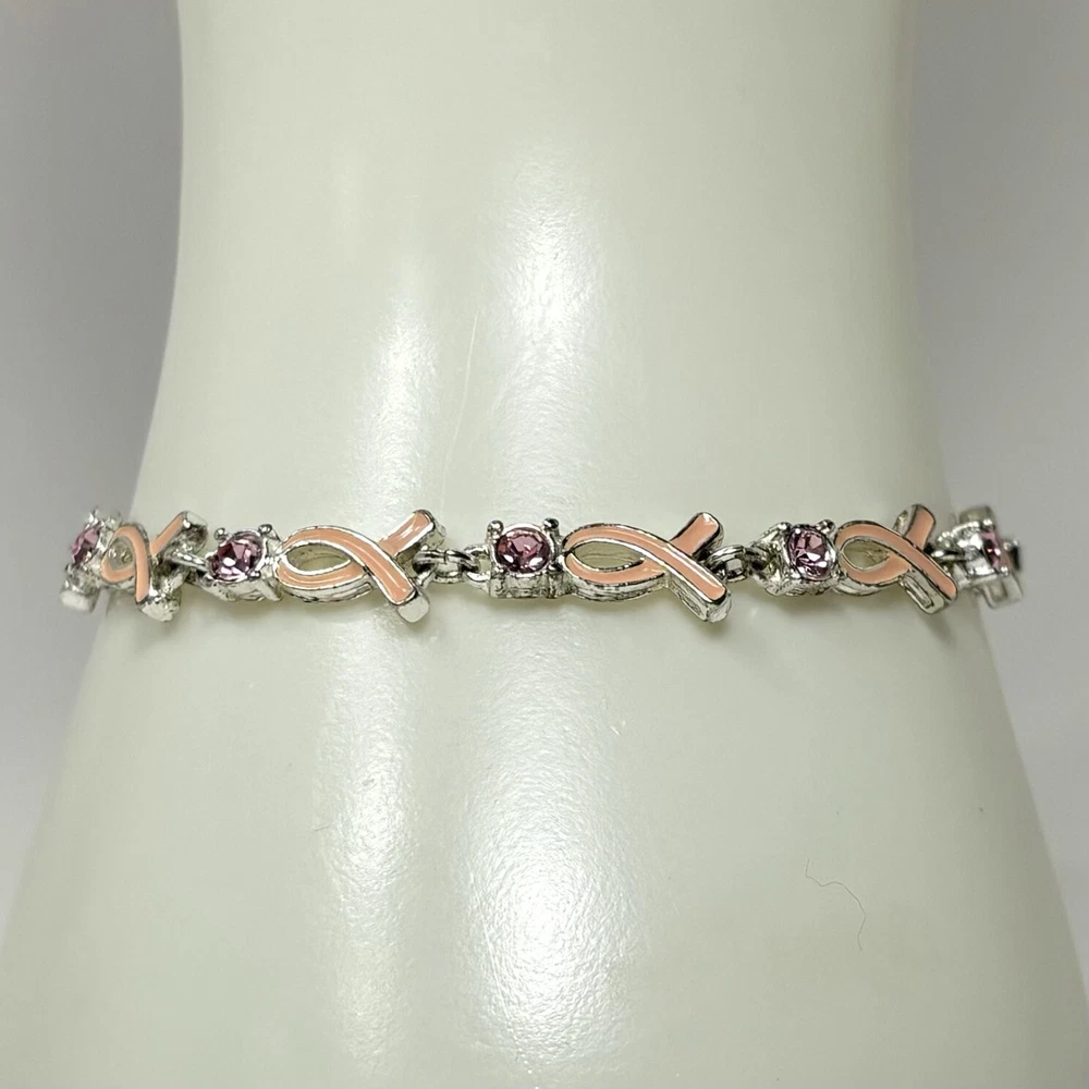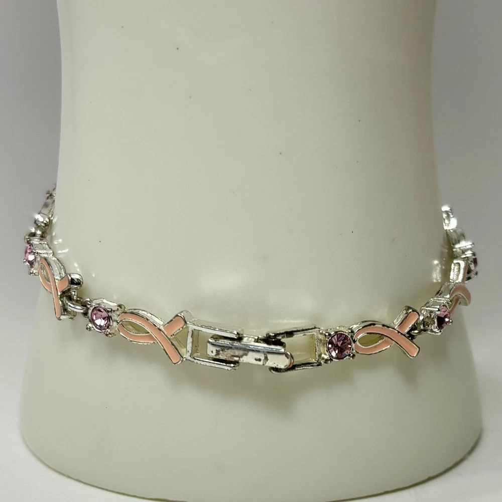 Avon Pink Ribbon Tennis Bracelet Breast Cancer Awareness Pink Rhinestones Size 7 Very good condition! There is a very small amount of discoloration on the clasp, otherwise the silver tone finish is intact and bright, as is the enamel finish on the ribbons. The pink rhinestones are clean and shiny. Please see pictures for details and message me with any questions.