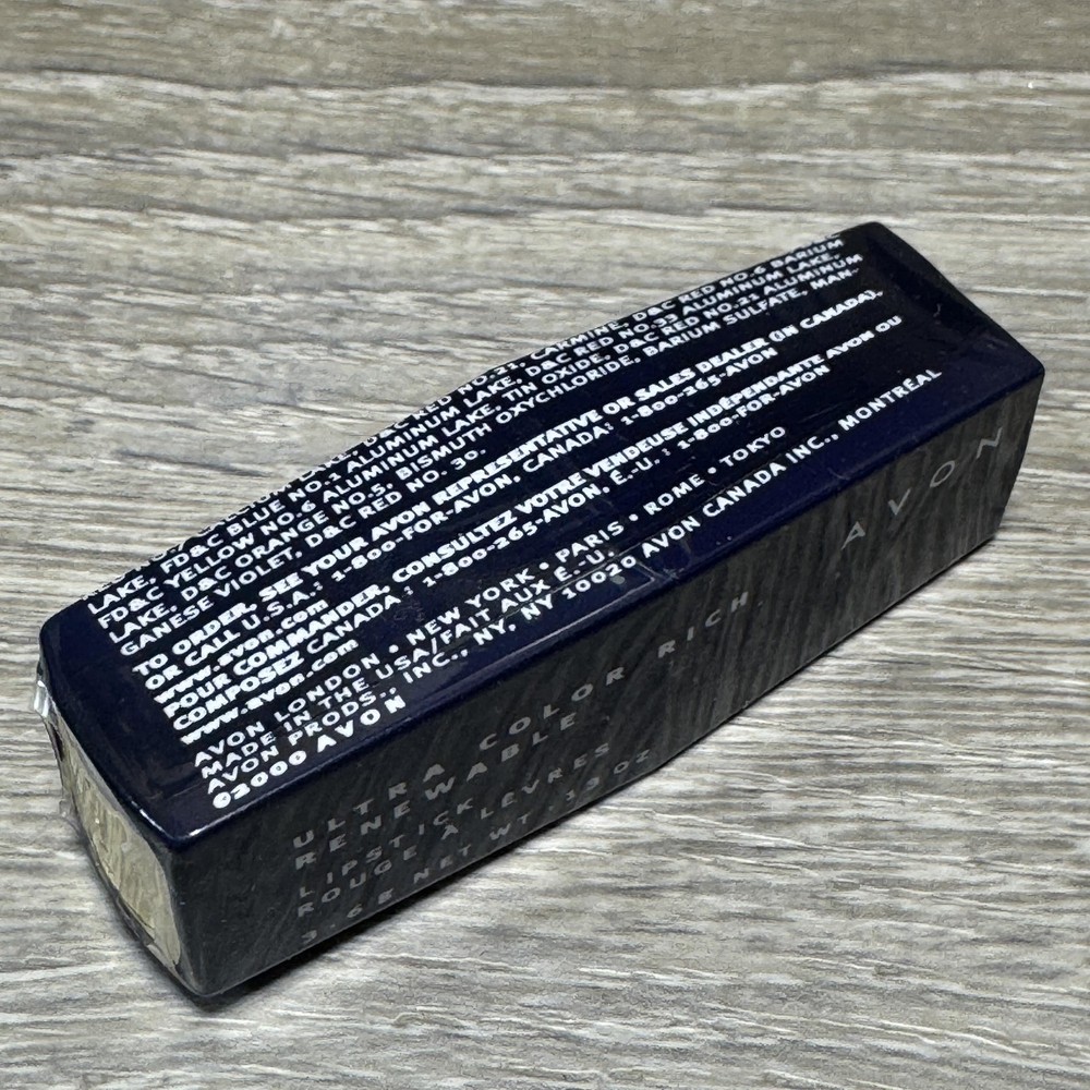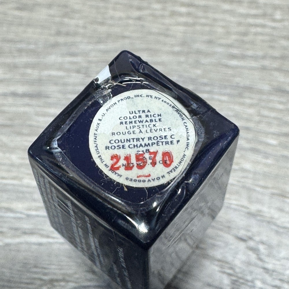 Avon Ultra Color Rich Renewable Lipstick Country Rose C Pink 3.5g Standard Condition: Brand New with Box -- factory sealed, never opened Shade: Country Rose C (Rose Champetre F 210) Type: Lipstick Net Weight: 3.5g / 0.13 oz Color: Pink AVON branding on gold cap, factory seal intact Full ingredient list visible on box (includes castor oil, beeswax, shea butter, mica, titanium dioxide, iron oxides, more) Distributed by Avon Products, Inc., NY; Avon Canada, Inc., Montreal Item size: Standard lipstick Batch/style code: 21570