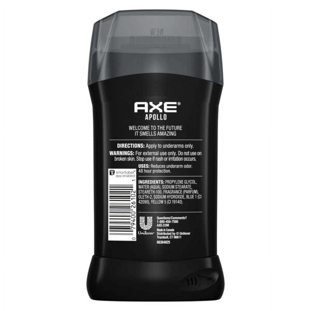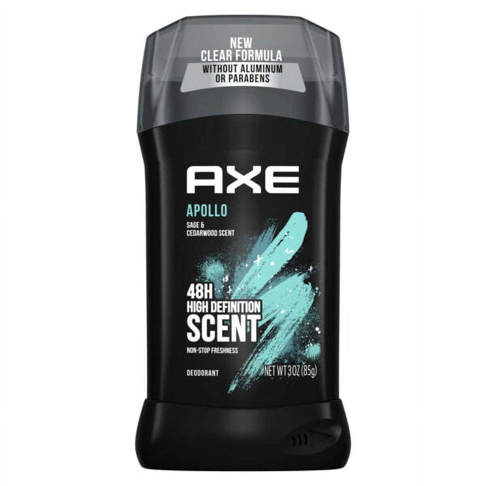 Product Description Axe Apollo Long Lasting Men's Deodorant Stick, Sage and Cedarwood, 3 oz Smell as fresh as you look. Because you never know when opportunity will strike, you need a stick deodorant that keeps you on point every day. With its 48h High Definition scent and upgraded fragrances, AXE Apollo Deodorant for men has got you covered. Always 100% fresh, the sage and cedarwood scents combine to leave you smelling great and feeling awesome. All. Day. Long. All new AXE Apollo Men's Deo now features our longest lasting fragrance ever! Bust odor and smell great for 48 hours. All day, all night – no matter what, you’re ready. Take care of yourself and our planet. Smell irresistible all day with AXE Apollo Deodorant Stick. Bust odor and smell fresh for 48 hours with our Deo stick, now with upgraded fragrances. AXE Men's Deodorant with new clear formula for a smoother glide. Our longest lasting scents ever. Aluminum free deodorant with no parabens for total odor protection. AXE Deodorant Stick for Men, Apollo, 3 oz provides all day freshness and odor protection to keep you confidently fresh for longer Apply to underarms only. Turn dial to raise product. Goes on smoothly and provides all day freshness and odor protection Smell irresistible all day with AXE Apollo Deodorant Stick Bust odor and smell fresh for 48 hours with our Deo stick, now with upgraded fragrances AXE Men's Deodorant with new clear formula for a smoother glide Our longest lasting scents ever; aluminum free deodorant with no parabens for total odor protection Apply AXE Deodorant to clean, dry underarms and feel fresher for longer with every swipe Ingredients Propylene Glycol, Water (Aqua), Sodium Stearate, Steareth-100, Fragrance, Oleth-2, Sodium Hydroxide, Blue 1 (CI 42090), Yellow 5 (CI 19140) Active Ingredients salicylic acid