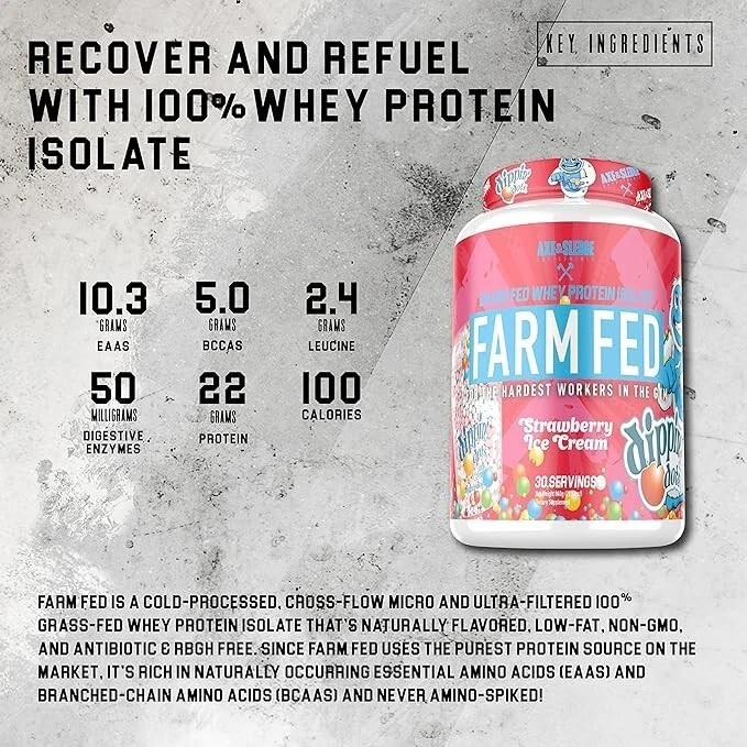 Improved Product Description for TikTok: Looking for a protein powder that works as hard as you do? Meet Axe & Sledge Farm Fed Grass-Fed Whey Protein Isolate — the ultimate blend of flavor and nutrition! 🌟💪 Key Features You’ll Love: ✨ Grass-Fed Goodness: Made from 100% grass-fed whey, giving you clean, high-quality protein. ✨ Banana Split Ice Cream Flavor: Indulge in the creamy, dreamy taste of banana split without the guilt. 🍌🍦 ✨ 30 Servings: A whole month's worth of protein-packed fuel! Why It’s Perfect for You: ✅ For Fitness Lovers: Whether you're building muscle, toning up, or recovering post-workout, it’s your go-to. ✅ For Busy Lifestyles: Need a quick meal or snack? Mix it in seconds for an instant protein boost! What’s Inside: 🌱 Ingredients: Grass-fed whey protein isolate, natural & artificial flavoring, stevia, and sunflower lecithin. 🍫 Nutritional Value (per serving): Protein: 22g Calories: 100 Carbs: 2g Fat: 0.5g Why Choose Grass-Fed? Grass-fed whey delivers a clean protein source with a better nutrient profile and no added hormones! Quick & Easy to Use: Mix 1 scoop with water, milk, or your favorite beverage. Blend into smoothies for an extra boost. Bake into recipes like protein pancakes! Fuel your day with the delicious taste and pure nutrition of Farm Fed Whey Protein Isolate. 🍦💪 Perfect for athletes, fitness enthusiasts, and anyone needing a clean protein boost!