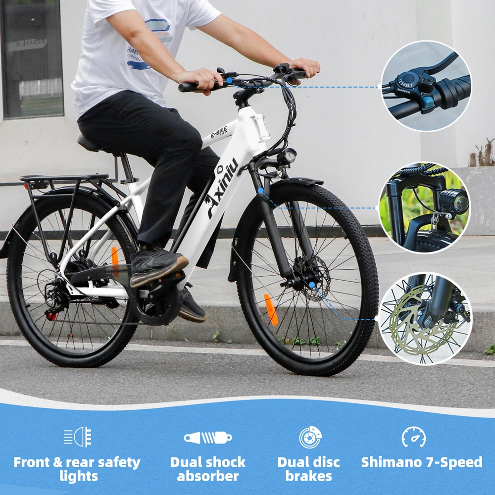 Charging Time: 4-6 hours Item Length: 72.05" Brake Type: Disc Brake - Mechanical EAN: Does not apply Motor Type: Rear Hub Motor Handlebar Type: Flat Bar Tire Type: Tires Custom-Built: No Material: Aluminum Number of Speeds: 7 Speed waterproof line: 9-core main waterproof line Item Weight: 61.7294334lbs Motor Power: 750W Item Width: 18.90” Frame Number: No UPC: Does not apply Bike Type: E-City Bike MPN: EG-HL03-W Brand: Axiniu Maximum Speed: 25mph Model: City Electric Bike Charger: 42V 2.0A, UL/CE certified, black, US standard Color: White Wheel Size: 26 in Safe standard: passed UL 2850 detection Features: Lights, Display, Fenders, Front Light,Removable Battery gtin13: Does not apply Manufacturer Warranty: 3 Years Country/Region of Manufacture: China Maximum Range: Up to 40 mi(Assist Mode) Model Year: 2024 Voltage: 36 V Gear Change Mechanism: Derailleur Gears Custom Bundle: No Item Height: 41.73" Department: Unisex Adult Max load: 330lbs Frame Size: 26 in Suspension Type: Rear