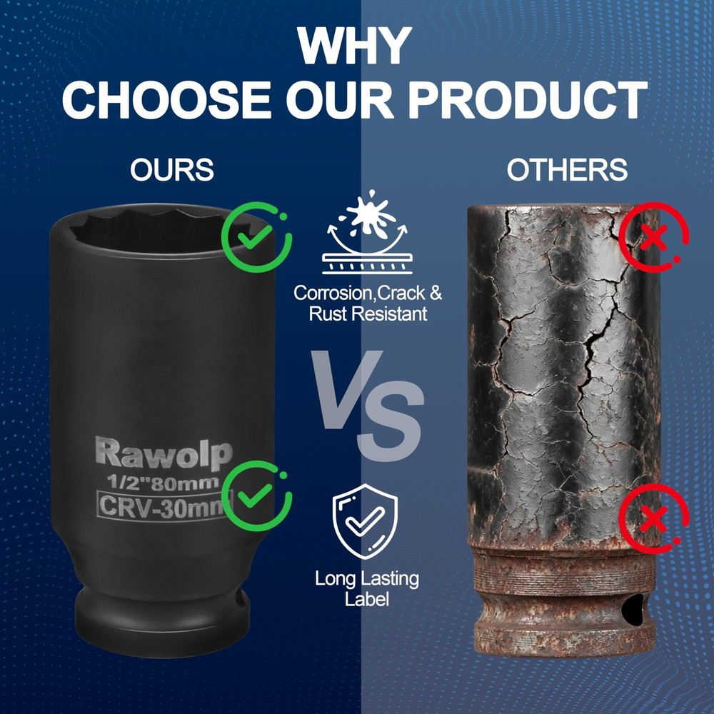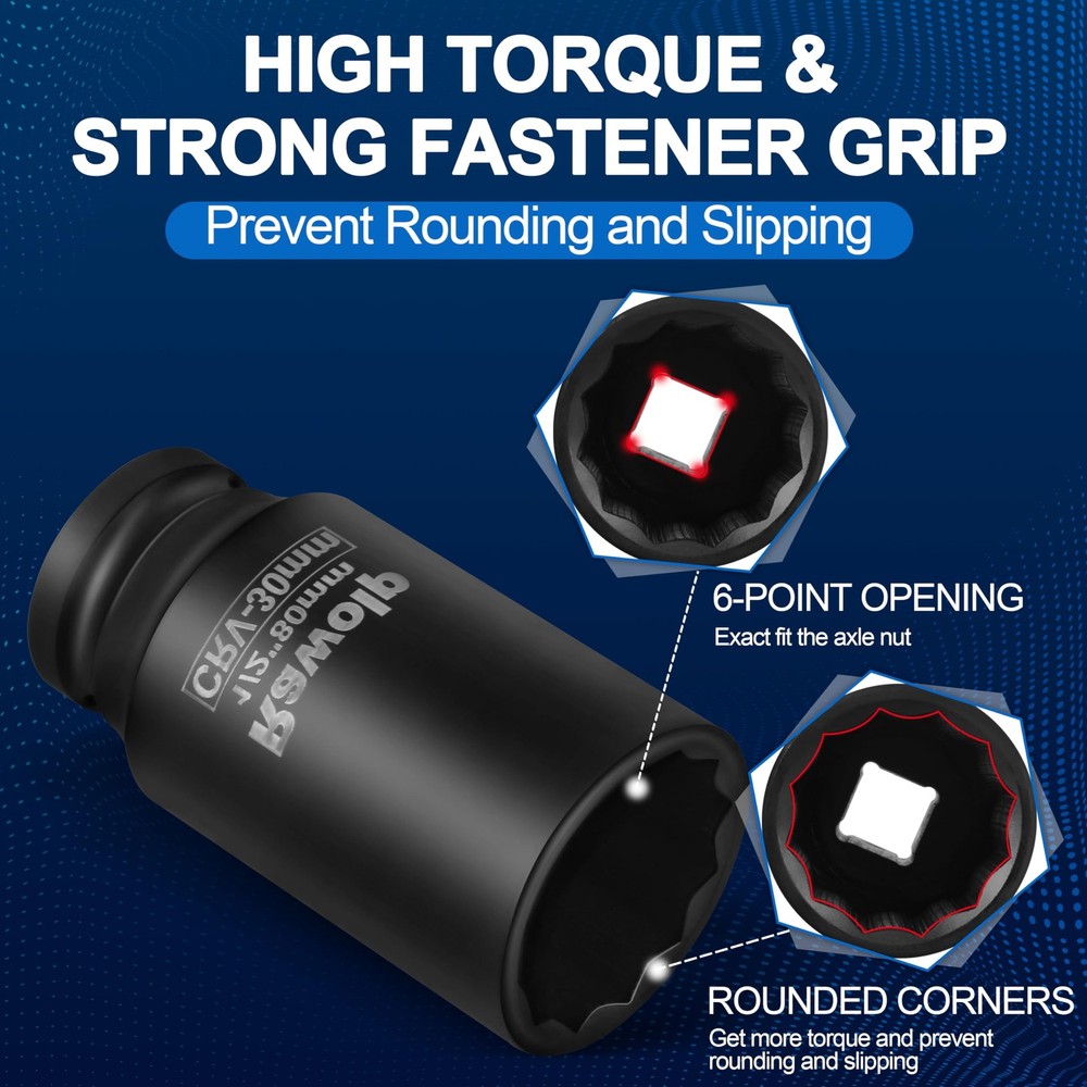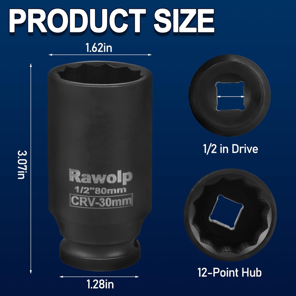 Axle Nut Impact Socket, 30mm 12-Point, 1/2 Inch Drive, Deep Well Hub 1pack Description This heavy-duty 30mm axle nut impact socket is engineered for precision and durability. Featuring a 12-point design and 1/2-inch drive, this deep well socket is specifically crafted for removing and installing hub lock nuts and axle nuts with ease. The socket's deep well construction provides extended reach for those hard-to-access areas, while its impact-ready build ensures reliable performance when paired with your impact wrench. Perfect for automotive professionals and DIY mechanics, this specialized socket helps make quick work of stubborn fasteners. The 12-point design provides multiple engagement points for better grip and reduced chance of fastener rounding. Whether you're working on wheel bearings, axle components, or other automotive applications, this socket is an essential addition to your professional tool arsenal. Features: COMPATIBILITY: 1/2-inch drive impact socket designed for axle nut and hub lock nut removal, fits most automotive applications PRECISION DESIGN: 30mm 12-point configuration ensures secure grip and prevents rounding of nuts during high-torque operations DEEP WELL FEATURE: Extended length socket provides additional reach for accessing deeply recessed nuts and fasteners DURABILITY: Constructed for use with impact wrenches, offering superior strength for heavy-duty automotive work SPECIFICATIONS: 1/2-inch square drive, 30mm size, 12-point design for optimal fit and torque transfer Product Details: Handling We will ship all orders within 3 business day of payment. Delivery We Do Not Ship Outside of the Continental US. Return Policy All items qualify for returns within 30 days of receipt. Buyer is responsible for return shipping on any item that is not damaged. Feedback We take our reputation seriously, we buy and sell online, so we understand the value of trust. If you are unsatisfied with your order, please contact us and we will work with you to resolve it to your satisfaction.