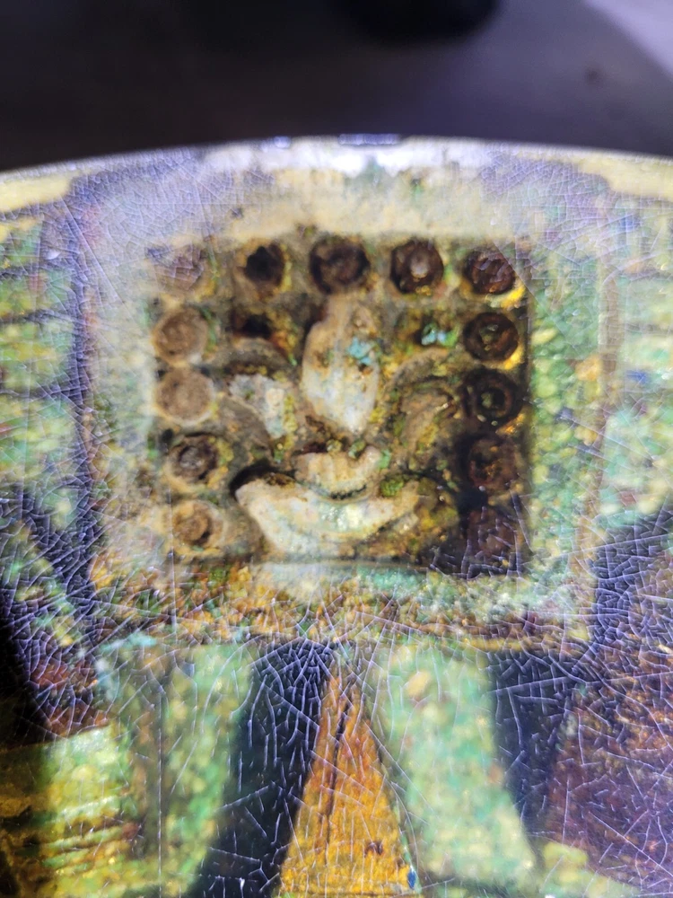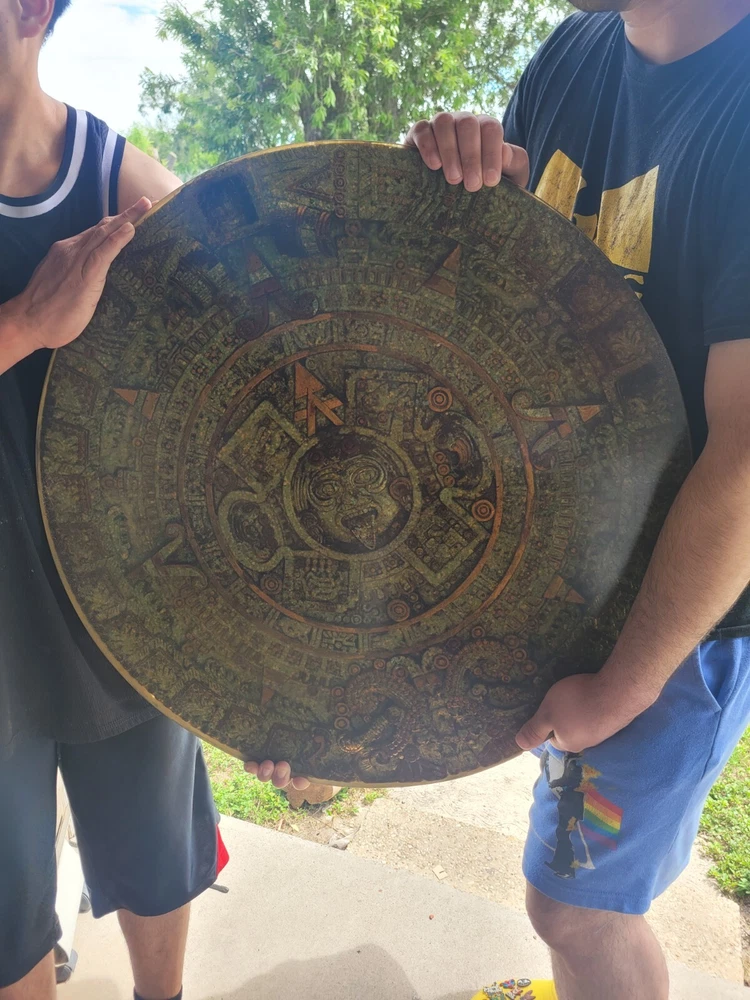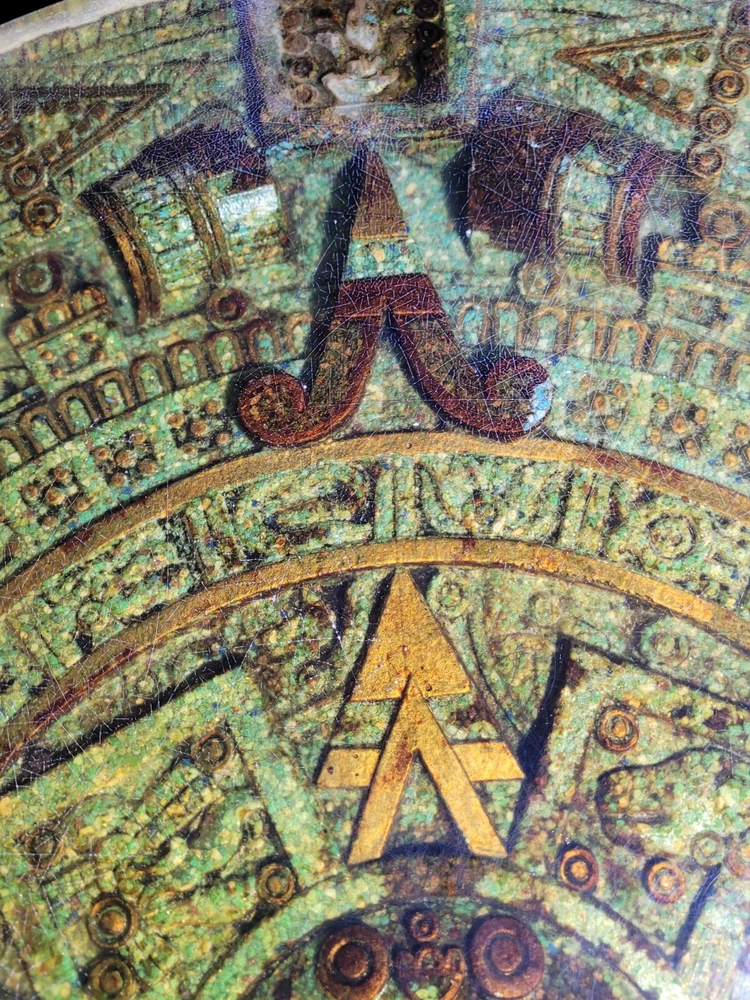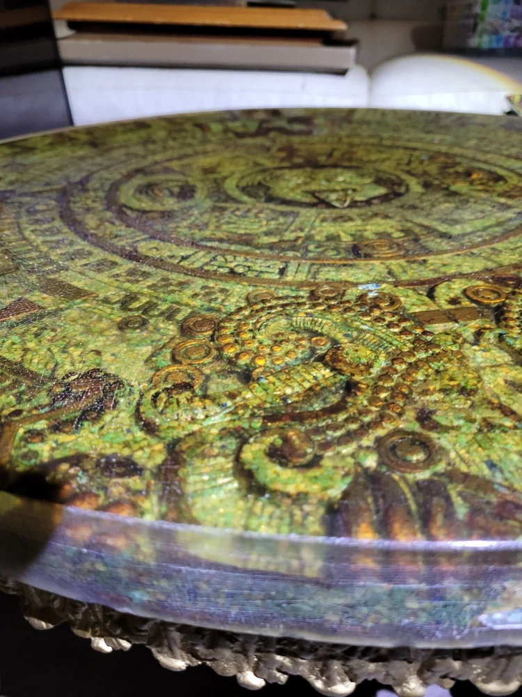 Beautiful coffee table of Aztec calendar, no makers mark but definitely Mexican product from the late 20th century. Looks like it is underwater.