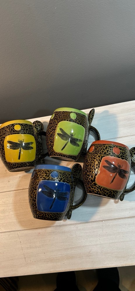 Elevate your morning routine with the Always Azul Pottery Coffee Mugs, a set of four that brings a touch of artistry to your daily coffee or tea experience. Crafted from high-quality stoneware, these mugs feature a vibrant multicolor palette and an enchanting dragonfly design . No flaws, all include spoons