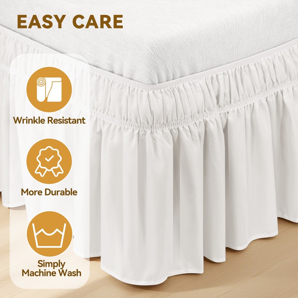 Perfect Fit for King Size Bed Skirt: Designed for King Beds (76"x80") & California King Beds (72"x84") with a 16" drop for full coverage and a polished look. No-Lift King Bed Skirt Installation: An adjustable elastic belt lets you wrap the Bed Skirt King around any mattress in seconds – no pins or heavy lifting required. Premium Bed Skirt for King Bed Fabric: Made from 100% fade/wrinkle-resistant polyester in elegant white– more durable than cotton while maintaining luxury appeal. Elevate Style with Bed Skirts King: Tailored ruffles transform your King Size Bed Skirt into a sophisticated decor statement. Effortless King Bed Skirt Care: Machine washable with quick tumble-dry low; Bed Skirt for King Bed stays crisp without ironing.