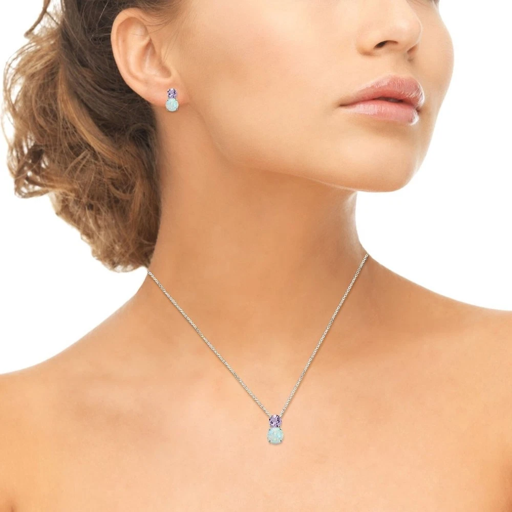 B. BRILLIANT Opal Necklace and Earrings Jewelry Set for Women or Bridesmaids, Genuine, Simulated or Created Gem & Opal Double Round Stones, .925 Sterling Silver Sets With Gift Box Product Details Color: Amethyst Brand: B. BRILLIANT MPN: US_JWEY_B079TW65GG UPC: Does not apply EAN: Does not apply Department : womens Date First Available : February 15, 2018 Manufacturer : GemStar USA Brand, Seller, or Collection Name: B. BRILLIANT Metal stamp: 925-sterling Metal: Sterling Silver Material: Sterling Silver Gem Type: Amethyst Minimum total gem weight: 2.59 carats Setting: prongs Height: 0.55 inches Width: 0.31 inches Length: 18 inches Chain: Rolo Clasp: Spring Ring Clasp Resizable: No Number of stones: 6 Stone Weight: 1.25 carats Model number: US_JWEY_B079TW65GG Sterling Silver Genuine, Simulated or Created Gemstone & Synthetic Opal Double Round Stud Earrings & Necklace SetThe necklace showcases a round 6mm gemstone nested above a 8mm synthetic opal gemstone, for a gorgeous two-stone friendship style set. The pendant measures 14mm in length and dangles from a 18-inch rolo chain that secures with a spring-ring clasp. The stud earrings feature a pair of round 5mm gemstones nested above 7mm synthetic opal gemstones. The earrings measure 12mm in length and secure by post with friction backs. Choose from the Following Colors:Amethyst, Garnet, Created Blue Sapphire, Created Pink Sapphire, Created Ruby, Simulated Emerald, Blue Topaz, White Topaz