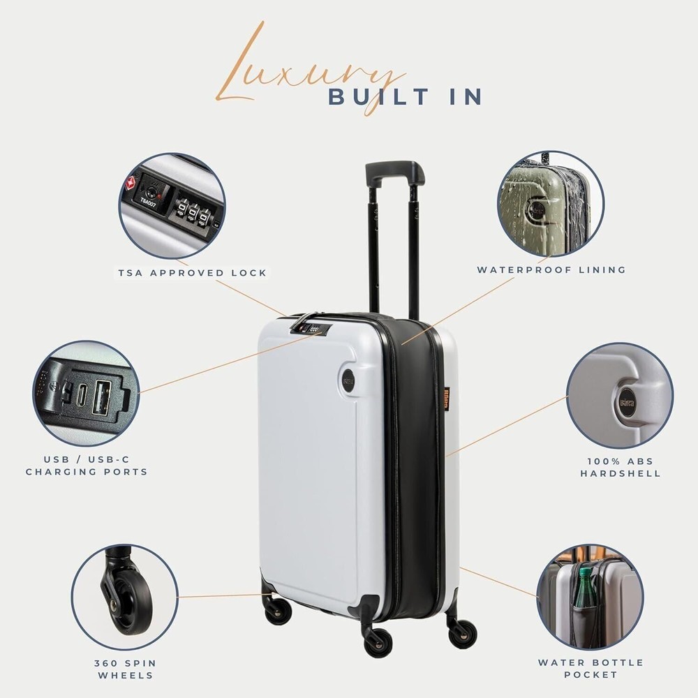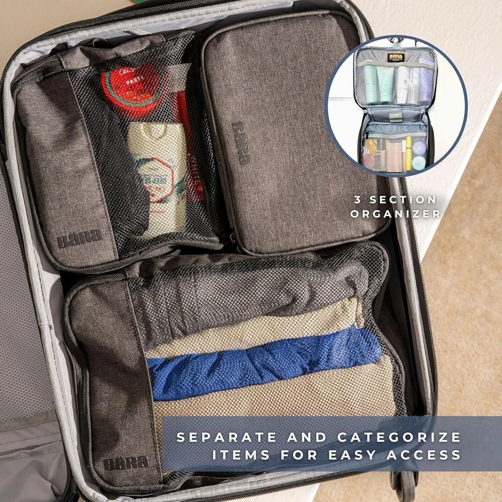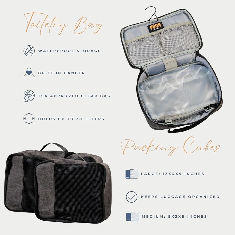 Unfolding your next adventure is more than just a tagline for us. It represents our commitment to providing you with a travel companion that enhances your exploration, inspires your curiosity, and simplifies your travel experience. Enabling effortless travel with innovation and convenience, BÄRA sets a new standard in lightweight TSA approved carry ons. Our mission is to enhance your journey by providing a versatile travel companion equipped with a built-in USB charging port with both USB and USB-C chargers, water bottle holder, 360-degree spinning wheels, and secure locking mechanism. Elevate your travel experience with the BÄRA Travel Set, a comprehensive solution designed to streamline your journey. This all-in-one set includes a Hardshell Collapsible 20 Inch Carry On Luggage, essential Packing Cubes, and a versatile Toiletry Bag, providing you with everything you need for organized and stress-free travel. The Hardshell Collapsible Carry On Luggage offers both durability and convenience, crafted from 100% ABS hardshell material to protect your belongings while featuring a collapsible design for easy storage. Maneuver through airports effortlessly with the 360° Spinner Wheels and height adjustable telescopic handle, ensuring smooth mobility from check-in to boarding. The included Packing Cubes are meticulously designed to maximize suitcase space and keep your belongings neatly organized, while the TSA Approved Toiletry Bag offers convenient storage for your essential toiletries with features like a built-in hook for hanging and multiple mesh pockets. Whether you're embarking on a weekend getaway or a long-haul journey, the BÄRA Travel Set provides the perfect combination of functionality, durability, and style to enhance your travel experience.