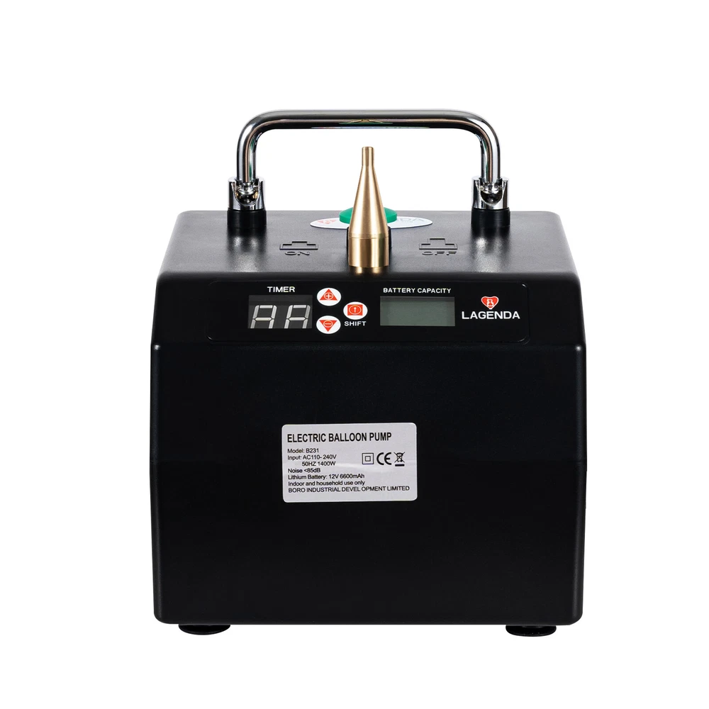 Description Colorful balloons have always been an essential decoration for parties, holidays, banquets, and other occasions, as they can always bring people into a good mood. But blowing up a large number of balloons is not an easy task. Instead of blowing them with your mouth, try this electric balloon pump. It is specifically designed for 160 long balloons and 5-inch double-set balloons, which can fill a balloon in just a few seconds. Your party will be easily filled with various dazzling balloons from now on! Package Included 1*Electric Balloon Pump 1*Bag 1*Nozzle 1*Power Cord 1*Balloon Tying Tool 1*English Manual B231 Balloon Pump Lagenda Portable Electric Balloon Inflator Air Blower Party Description Colorful balloons have always been an essential decoration for parties, holidays, banquets, and other occasions, as they can always bring people into a good mood. But blowing up a large number of balloons is not an easy task. Instead of blowing them with your mouth, try this electric balloon pump. It is specifically designed for 160 long balloons and 5-inch double-set balloons, which can fill a balloon in just a few seconds. Your party will be easily filled with various dazzling balloons from now on! Key Features High Efficiency: The internal 1400W pure copper motor provides stable and strong airflow, which can blow a balloon in just a few seconds, saving you time and energy. Two Operating Modes: This user-friendly balloon pump offers both manual and semi-automatic pumping modes, meeting the needs of both beginners and professionals. You can press the switch to start/stop inflating, or you can set the time to semi-automatic vent. Easy to Operate: The front control panel helps you better control the balloon pump. You can choose the duration in units of 1 second or 0.1 second, or press and hold the + key to zero. The counting function and clear display screen allow you to know the working status. It also supports connecting two machines for use together, inflating two balloons simultaneously! Long Endurance: The 6600mAh large-capacity battery eliminates the hassle of frequent charging! You can use it for quite a long time at a full charge, and the battery display function also allows you to monitor the usage of the battery at any time. Lightweight & Portable: It is lightweight(5.95lbs) and portable(6.3*5.9*5.1in), and with our matching backpack, you can easily carry it to the place you need to start working. The foldable handle at the top allows you to easily and firmly grasp it. Low Noise: Its operating noise does not exceed 85dB, similar to the volume of people talking outdoors. You don't have to worry about it disturbing you or the people around you. Safe & Assured: The insulated plastic shell, wide voltage design, and high-power triangular plug allow you to work without worrying about safety issues. Decoration Assistant: It can inflate hundreds of balloons in an ultra-fast time, allowing you to complete holiday or party decoration requirements in a short time, creating a cheerful and beautiful atmosphere. Details Round Corners: They can better care for your skin, avoid scratches, and improve your experience. Copper Nozzle: Copper is more wear-resistant and sturdy, which can perform well for a long time and achieve a longer service life. Heat Dissipation Holes: Efficient heat dissipation holes located on the side and bottom can quickly exhaust the hot air generated during operation, avoiding damage to the machine caused by overheating. Anti-slip Feet: The four anti-slip feet at the bottom can maintain stability and prevent scratches on your desktop. Application It is suitable for inflating 160-long balloons and 5-inch double-set balloons, making great decorations for various weddings, birthdays, baby showers, graduation ceremonies, Christmas, anniversaries, and other special celebrations. How to Use Take the air inflator from the box, and turn on the switch. Put the balloon on the copper nozzle and press the green button lightly for air inflation, then release the button to stop inflating. If the battery is out of charge, please insert the plug into the socket and turn on the switch to charge the battery, the inflator can work while charging. Please turn off the switch after finishing the air inflation. Specifications Model: B231 Material: Plastic, Copper Color: Black Shape: Rectangle Voltage: AC110-240V, 50Hz Power: 1400W Noise: <85dB Input: DC 13.8V Plug: US-Standard Assembly Required: No Number of Items: 1 Charging Time: 8 Hours Lithium Battery: 12V, 6600mAh (Included) Time Range: 0.1-9.9s Time Adjustment Unit: 1s, 0.1s Power Cord Length: 2m/6.56ft Handle Length: 11cm/4.33in Nozzle Diameter: 4.6mm Bag Size: 19.5*18.5*17cm/7.67*7.28*6.7in Gross Weight: 2.9kg/6.4lbs Net Weight: 2.7kg/5.95lbs Product Size: 16*15*13cm/6.3*5.9*5.1in Package Size: 20.5*19.5*20.5cm/8*7.67*8in Package Included 1*Electric Balloon Pump 1*Bag 1*Nozzle 1*Power Cord 1*Balloon Tying Tool 1*English Manual Notes Please carefully read the manual and strictly follow the precautions to have a better experience. Please note that this product is only suitable for 160-long balloons and 5-inch double-set balloons, and it is filled with air, so the balloon will not float. Please be careful not to use this product in damp environments or outdoors. When not in use, please cut off the power supply promptly. Please keep children away from this product. After working for a long time, it is normal for the body to get hot. Simply turn off it to cool down and continue working. Please do not use this product continuously for more than two hours or block the nozzle to avoid damage to the machine. Please do not face the nozzle during use to avoid injury. Please allow the slight color difference caused by the shooting light and 1-3cm error due to manual measurement, and make sure you do not mind before you order. CHOKING HAZARD – Children under 8 yrs. can choke or suffocate on uninflated or broken balloons. Adult supervision require