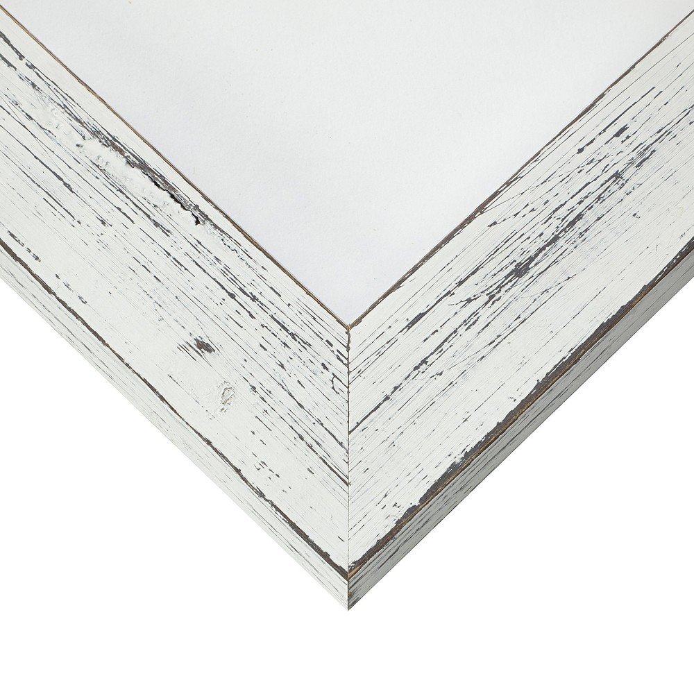Rustic style; weathered white with visible wood grain; painted finish Frame includes: glass, rigid black backing and pre-attached stamped hanging hardware Frame holds a 8 by 12-Inch photo/print/poster (viewable area reduced by .25" on each side due to frame lip) Frame moulding is 1.5 inches wide; solid wood construction Frame is designed for WALL HANGING only (hanging hardware allows for portrait or landscape orientation)