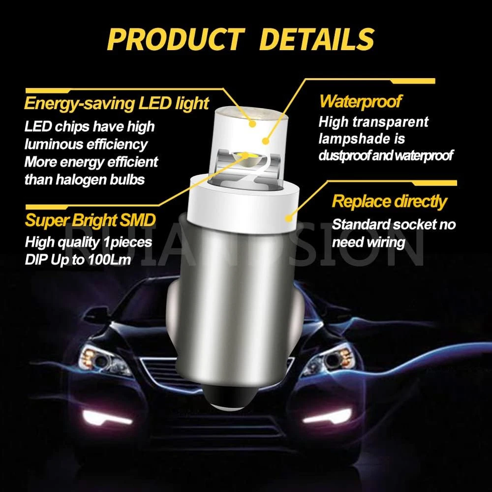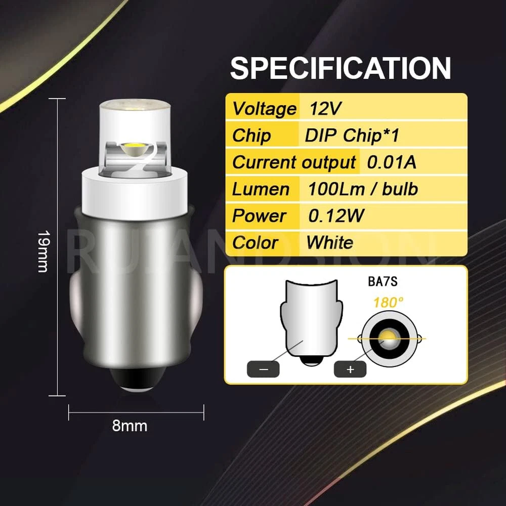 Store New Arrivals Add to Favorite View Feedback Contact BA7S Instrument LED Light F3 1 LED 12V DC White Car Mini Bulbs Lamps Led Car Instrument Light Warning Lamp,Negative Earth (Pack of 4) Description Item Package Quantity 1 Safety Rating CE, RoHS Color White Mirror Lighting Type automotive-instrumentation-clock-light-bulbs Manufacturer Part Number ASBA7S-1-12V*4 Item Weight 0.317 ounces Voltage 12 Volts Auto Part Position Center Model BA7S Operating Life 50000 Hours Is Discontinued By Manufacturer No Package Dimensions 5.04 x 4.33 x 0.43 inches Light Source Type instrument light Fit Type Universal Fit 1.Model: BA7S, LED Color: White, Lumen:100LM, Size:19*8mm (LxD). 2.Polarity:Negative Earth(positive"+" at bulb tip), not suitable for positive earth system. 3.LED bulb is low power consumption,so counted by theoretical power but not actual power. Because the resistor on bulb so that actual power is much less than theoretically power 4.LED bulb has resistance so that bulb will become hot when working while it not affect its performance 5.Warranty for 12 months, replace new one at free after confirmation of our product photos from customer. Socket:BA7S Voltage:DC 12V Beam Angle: 360° Output power: 0.1W/bulb LED Chip: F3 LED Polarity:Negative earth Brightness: 100 Lumen Size:19*8mm(LxD). Working temperature: -40℃ ~ +70℃ Lifespan: Up to 50,000hrs Color: White Fit: Car instrument light Warning lamp Warranty for 12 months, replace new one at free after confirmation of our product photos from customer. ABOUT US We offer the best prices around on high quality products. Our E-store includes media such as books, movies, music and games while offering electronics, toys, sporting apparel, clothing, tools, general home, garden items and more. SHIPPING We are always working hard to ensure your package arrives as soon as possible. Please understand that some factors like weather, high postal traffic, and the performance of shipping companies are outside of our control. We offer free shipping to the lower 48 states and ship within 2 business days of payment, usually sooner. We do not accept P.O. Boxes. Please provide a physical address. For shipping outside of the continental USA, we only use eBay's Global Shipping Program.The item is shipped to KY and then sent to the rest of the world. International customers are responsible for all duties and taxes. Continue to check out in order to calculate costs for shipping the item to your country. Messages regarding eBay's Global Shipping Program MUST be directed at eBay EXCLUSIVELY. RETURNS We offer a 30-Day Return Policy on items which you are not completely satisfied with. You have the option for a full-refund or an exchange of the item. No returns are available on items shipped outside of the USA. PAYMENT We accept PayPal. CONTACT US This page content is yet to come Please ad us to your favorite seller and visit again later Thank You CUSTOMER SATISFACTION We try our very best to make sure every customer is completely satisfied. If there's a problem, message us! We're happy to help. WE ACCEPT Copyright © 2021 AutoDS. | All Rights Reserved