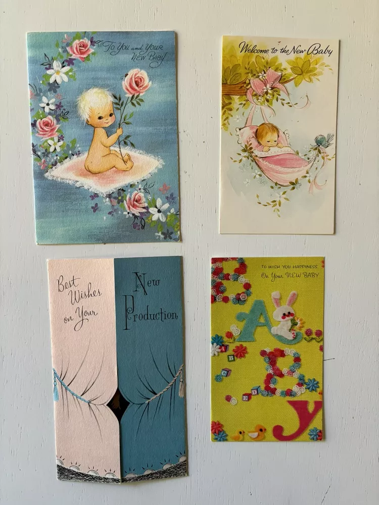 Vintage mixed lot of unused greeting cards for new baby, anniversary and wedding. Only one envelope. Please see photos. New baby Wedding Anniversary Retro Mid century