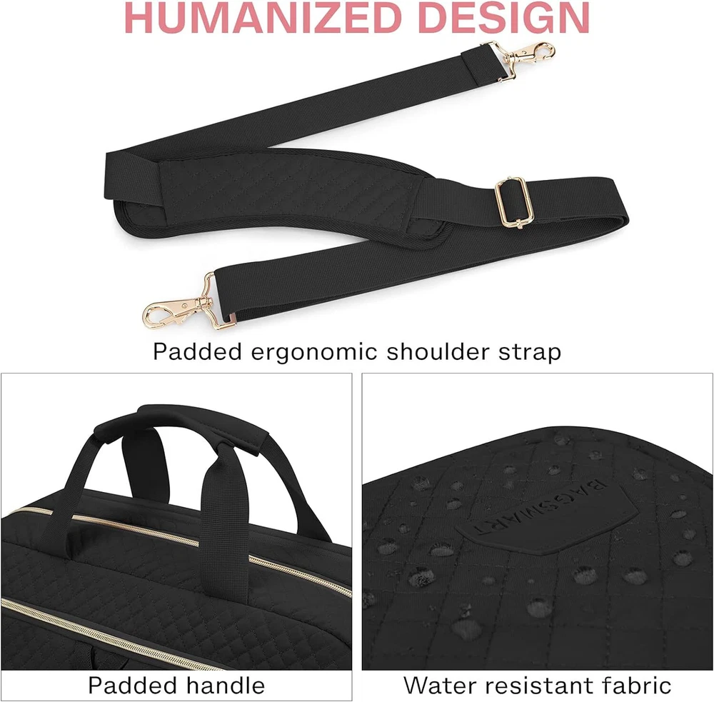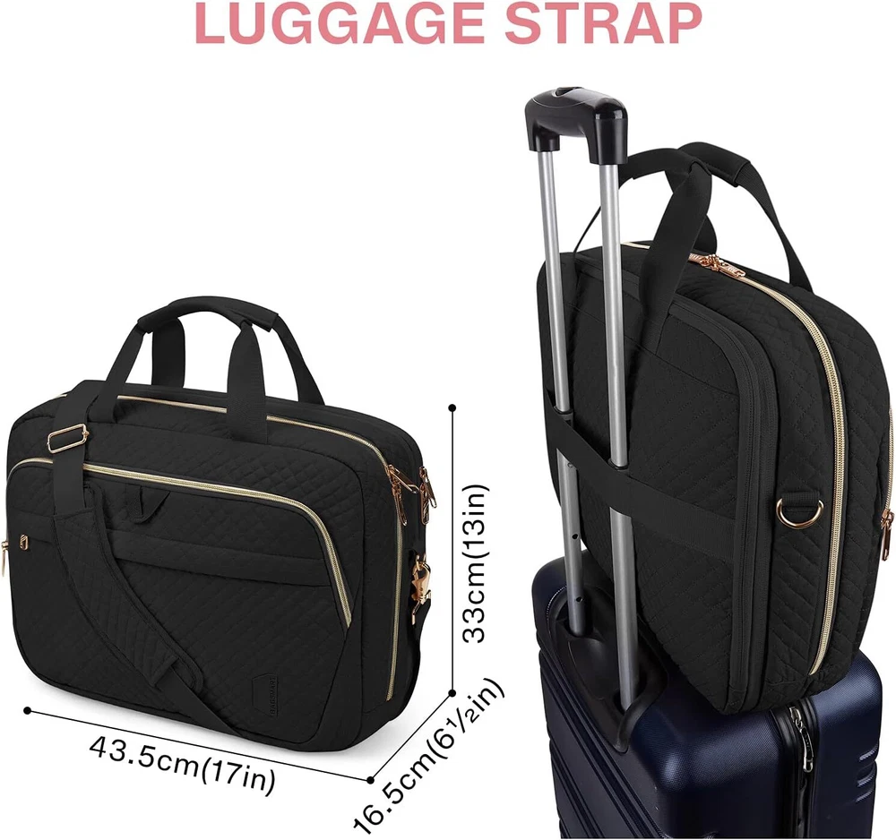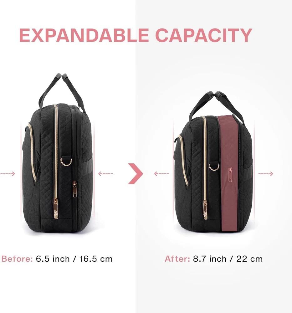 BAGSMART 17.3 Inch Laptop Bag Expandable Briefcase for Women Large Black Product Details Brand: BAGSMART Item Weight: 1.68 pounds Product Dimensions: 17.1 x 6.5 x 13 inches Item Dimensions LxWxH: 17.1 x 6.5 x 13 inches Color: Black Department: womens Country of Origin: China EXPANSION & MULTIPLE COMPARTMENTS- 17.1"L x 6.5''(up to 8.7'') W x 13"H; weight: 2.31 lbs. The expansion zipper makes it more flexible, the laptop briefcase can be transformed as a large duffel bag when necessary. Up to 4 compartments can meet all your needs well. The large tech compartment can fit up to 17-17.3 inch laptop. Two front pockets allow you to put daily necessities in an organized manner.The expandable document compartment can storage your A4 folders, magazines, clothes or umbrella TSA FRIENDLY- Convenient at checkpoint. A separate tech compartment with large opening design can make you quickly pass at airport security, also keeping your laptop, 12.9'' iPad and other tech gadgets tidy COMFY & ORAGANIZER POCKETS- Adjustable and "C" curve padded ergonomic shoulder strap relieves stress of shoulder; padded vegan leather handles offer light-weight carrying; luggage strap allows laptop office bag to slide over the luggage tube; and lost of organizer pockets aim to ensure a easy business trip or daily commuting LAPTOP PROTECTION- The dedicated laptop compartment is fully padded with EVA foam. The laptop bag can offer the optimal protection for your laptop. You don't need to worry about your notebook getting crashed on the travelling LONG LASTING- Made of durable water resistant polyester fabric, with metal hooks and metal zippers to provide a sturdy and reliant using experience. It's perfect for professional office work, business travel, weekend getaway or school life. Its simplicity look can serve as a laptop carrying bag, laptop crossbody bag, shoulder bag, business bag for women The BAGSMART 17.3 inch laptop expandable briefcase is the perfect companion for the professional business person. Its appearance is clean and unobtrusive, allowing to use it for all occasions, to be combined with and integrated within diverse personal styles. Whether you are digital nomad, business person or college student, this multiple compartments laptop bag would be a smart choice for you. Specifications Weight: 2.31 lbsDimensions: 17.1"L x 6.5"W x 13"HPrimary Material: Water-resistant polyesterBest Uses: work, business trips, commuting, travel, school What DIGI SMART Compartment Can Offer to You? Extra protection for laptop edges with EVA foam;Large opening for easily access and fast TSA checkpoint;All laptop accessories together- a 17.3 inch laptop compartment, a dedicated pocket for 12.9 inch iPad, 2 mesh pockets for accessories like laptop charger, mouse, kindle, notebooks, etc.Metal anti-theft zippers enhances the security of compartment. Besides DIGI SMART, What Other 3 Storage Spaces this Messenger Has? Expandable documents compartment with 1 extra divider- large capacity for A4 folders, magazines, documents, books, clothes, umbrella and other travel or business accessories;Large front easy access pocket- storage passport, pens, power bank, books or other small accessories; Small front pocket with 2 mesh pockets- keep your small items like keys, change purse, tissue, etc. Why Our Shouler Bag is Comfortable to Wear? Adjustable padded ergonomic shoulder strap adds comfort;Padded vegan leather handles for easily take on the go;Back luggage strap allows this office bag to slide over the luggage upright handle tube for easy transport;High-quality water resistant fabric, metal hooks and metal zippers make this carry on bag more sturdy and durable.