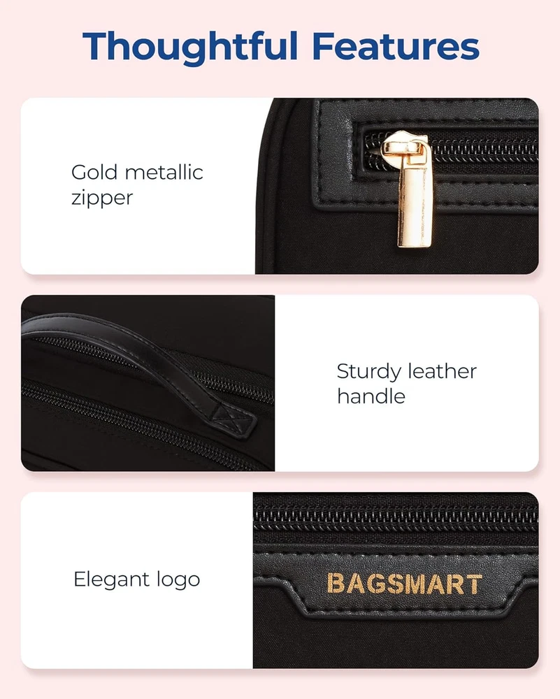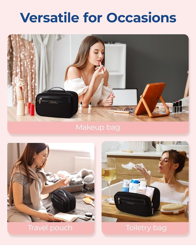 BAGSMART Toiletry Bag for Women, Travel Makeup Organizer, Wide-open Black Product Details Product Dimensions: 9.06 x 5.31 x 4.53 inches Item Weight: 7.4 ounces Department: Women Manufacturer: BAGSMART Country of Origin: China Item model number: BM0108052AN 【Efficient Storage Solution】This makeup bag organizer is designed with multiple compartments. The front compartment is perfect for storing bottles of cosmetics and toiletries, and it also features two storage pockets inside for blushes and lipsticks. The rear compartment is spacious enough to hold large eyeshadow palettes, cushion Foundation, blushes and loose powders. Additionally, the zippered divider pocket can securely store eyeliners, mascaras, lip glazes, and other longer items. The PVC clear pocket is designed specifically for holding makeup brushes, sponges and puffs. 【Quick Access to Items】The BAGSMART travel makeup bag can be unfolded almost 180 degrees, providing a spacious opening for easy access to your cosmetics, toiletries, and other travel essentials. The exterior quick-grab pocket is thoughtfully designed to store small items for touch-ups, such as lip glosses and lipsticks. Measuring 9.0*4.5*4.5 inches, it's perfect for organizing your daily cosmetics and travel essentials for a week's travel! 【Easy-to-Clean Pockets】This makeup travel bag comes equipped with 1 PVC stain-resistant zipper pocket, ideal for storing a full set of makeup brushes, sponges, and powder puffs. A simple wipe-down keeps them clean, eliminating worries about makeup stains. 【Premium Quality】This BAGSMART cosmetic bag is made of water-resistant polyester for excellent durability and protection. This make up bag features custom metal zippers that ensure smooth operation, and a sturdy leather top handle that makes it easy to carry. Its well-organized interior, combined with its fashionable design and portability, make it an ideal choice for a stylish and convenient makeup bag. 【Versatility】With an elegant and charming appearance and available in 5 colours, this large makeup bag serves not only as a travel companion but also as a versatile toiletry bag, travel wallet, tech accessory organizer, travel accessory bag, or daily storage pouch. These cosmetic bags for women are perfect gifts for Women's Day, Valentine's Day, birthdays, anniversaries, Mother's Day, and other holidays.