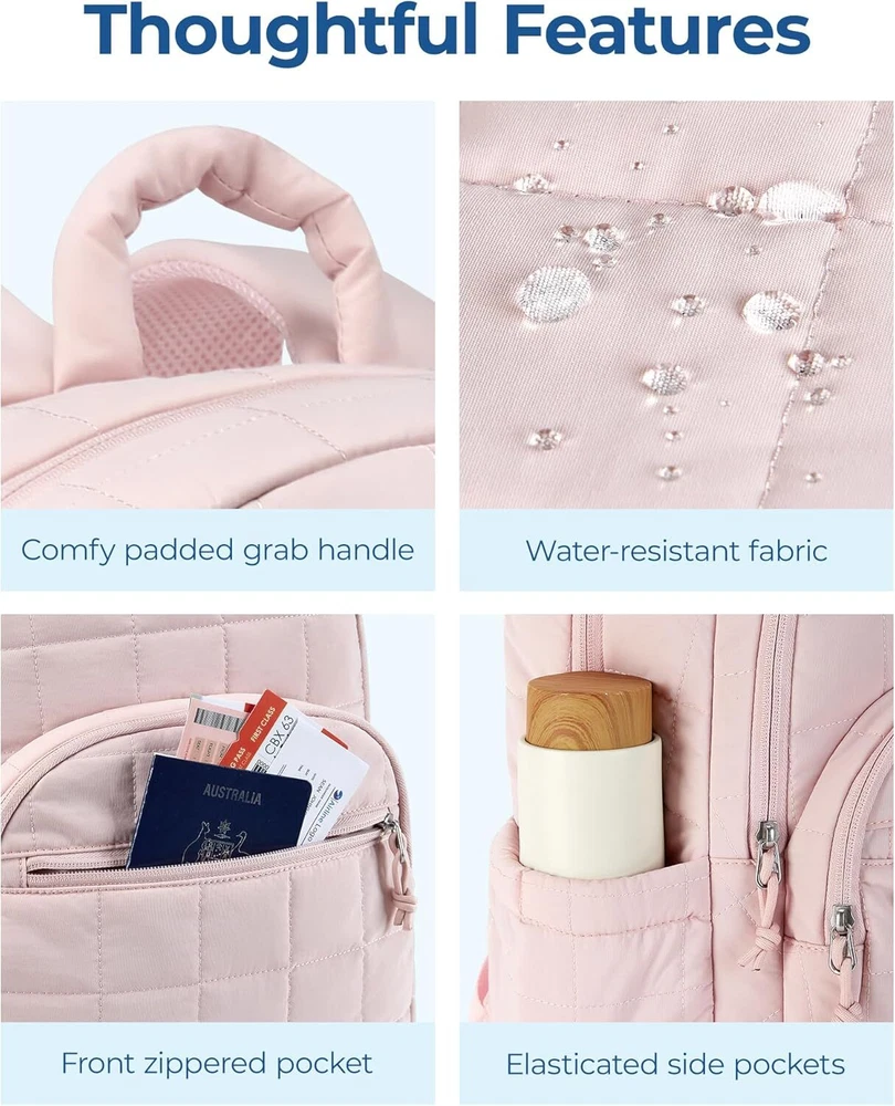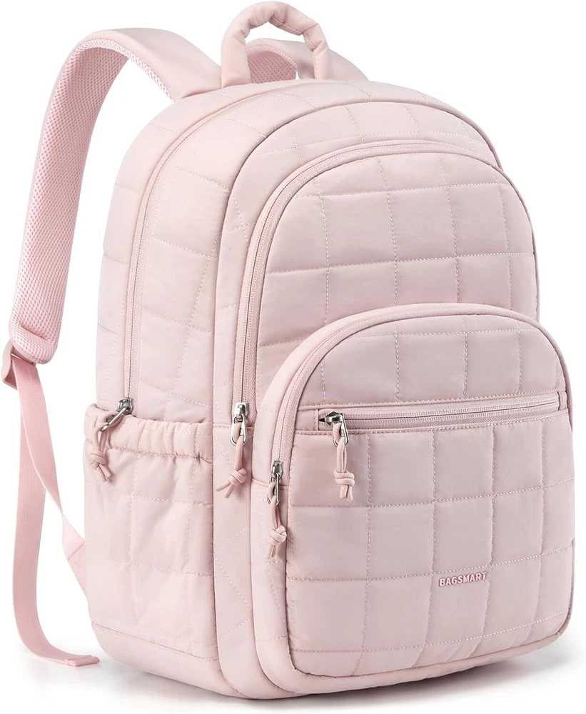 BAGSMART College Laptop Backpack, Travel Backpack for Women, Pink Product Details STYLE MEETS FUNCTIONALITY: Our women's backpack combines style and practicality, you don't have to compromise on fashion for functionality which allows you to showcase your unique style while comfortably carrying all your essentials AMPLE COMPARTMENTS: Stay organized and prepared with the BAGSMART Laptop backpack. With its thoughtfully designed compartments, you can easily separate and store your 15.6" laptop, books, supplies, and more. No more searching for items in a cluttered bag - everything has its place. Dimensions:17.3×11.8×7.9 inches ENHANCED COMFORT: The padded straps ensure an even distribution of weight, while the breathable mesh on the backside keeps you cool and provides ergonomic support for your back. Even when filled with heavy books and supplies, you can enjoy a comfortable carrying experience VERSATILE ALL-IN-ONE BACKPACK: TSA Friendly, the strap on backside allows easy slides over suitcase handle, whether you're going on summer holiday, weekend getaways, family trip, hiking, camping, or any other outdoor activity, our travel backpack is a reliable companion, a real travel essentials you must have