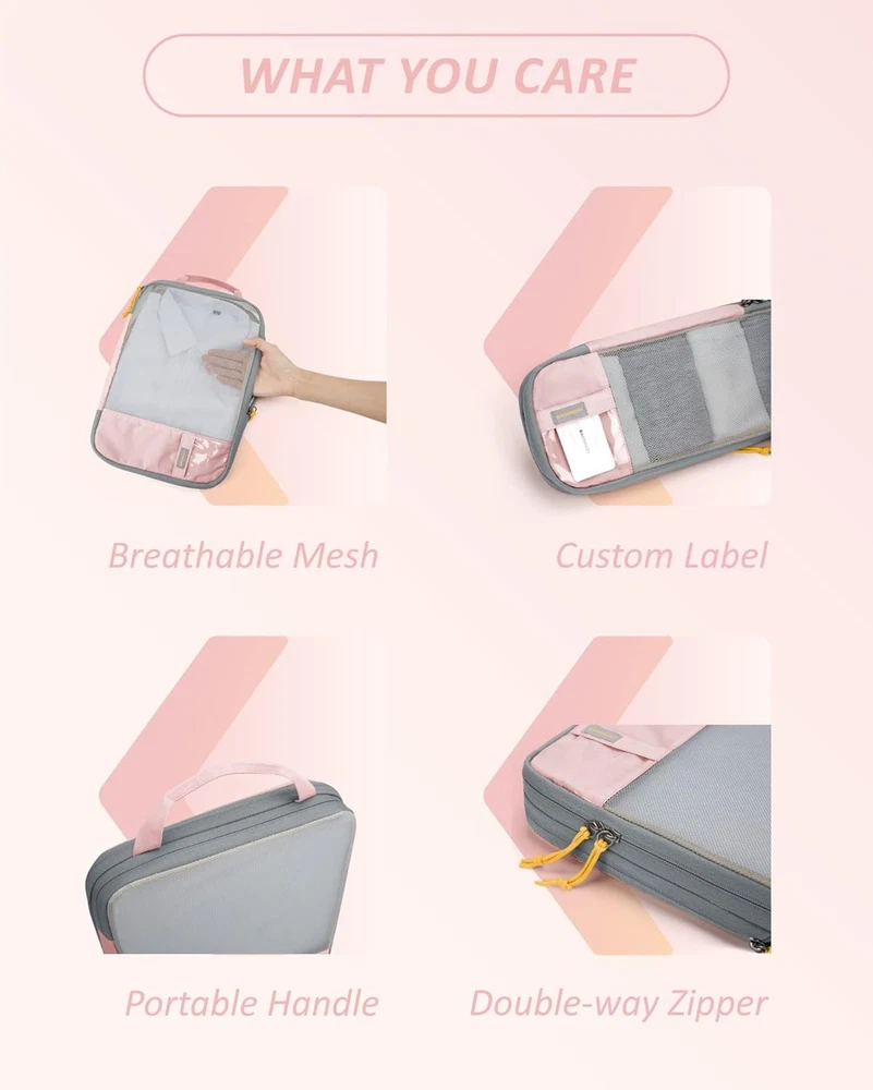 BAGSMART Compression Packing Cubes Travel Luggage Organizer BAGSMART 6 Set/4 Set/2 Set Compression Packing Cubes for Travel, Lightweight Vacation Travel Essentials, Travel Accessories for Suitcase Organizer Bags Set, Durable Luggage Organizer Travel Bags Date First Available June 16, 2023 Manufacturer BAGSMART ASIN B0C88RNZXF Product Warranty For warranty information about this product, please click here Best Sellers Rank #512 in Clothing, Shoes & Jewelry (See Top 100 in Clothing, Shoes & Jewelry) #3 in Travel Packing Organizers Customer Reviews 4.6 4.6 out of 5 stars (12,800) Brand BAGSMART Features 6 Set Compression Packing Cubes - If you'll be preparing multiple outfit options for your travel, you no longer have to sacrifice style for luggage space when you come across BAGSMART PACKING CUBES. Large for jackets, sweaters, and trousers, Medium for shirts, and blouses, Small for underwear, drawstring can be used as a laundry bag to separate your dirty/wet clothes or shoes. True Space Saving - These compression travel cubes are kind of like how a vacuum sealer works. Done by adding an extra zipper around the outside that can be zipped up to help squash clothes down and minimize the space inside. It’s remarkable how much of a difference they can make. Help travelers “Fit Double the Amount” in their suitcases. Durable Travel Essentials - We're sure you'll want to make sure you get a high-quality suitcase organizer that won't break in a few months. Hundreds of experiments simulating real-use scenarios have enabled us to improve the durability. And, it’s also worth noting there’s an ID tag pocket on the front of the packing organizers to help you further optimize your packing scheme. So you can remember which cube contains your favorite T-shirt. Lightweight Travel Accessories - Super light fabric ensures packing your clothes neatly in luggage without adding extra weight. Great for when you want to minimize weight as much as possible and save space within your suitcase. What We Care - Every traveler has their packing style preferences, and BAGSMART provides plenty of flexibility for any type of traveler. We hope to sell not just a commodity, but also a love. Love to travel, love the outdoors, love the journey of you. If there are any quality problems, please do not have any hesitation. Contact us for a timely and satisfactory answer! Our Business 100% Customer Satisfaction We go above and beyond to ensure you receive the best level of service. Returns We want you to be happy with your purchase, however in the rare occasion that you are not, please let us know and we will contact you to arrange either a collection or a refund. Please CONTACT US before leaving any negative feedback and we will promptly sort out any issue with your order. 8581550