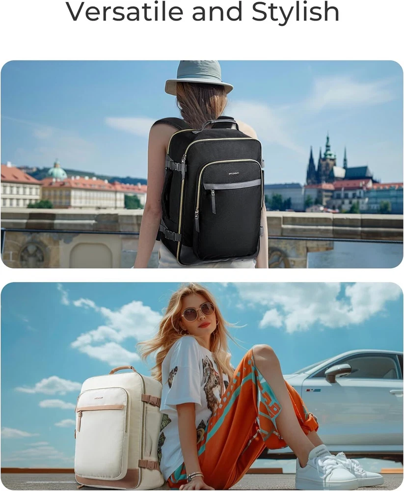 BAGSMART Travel Backpack for Women, Large Personal Item Bag, 40L Beige Product Details Product Dimensions: 8 x 13 x 18 inches Item Weight: 1.83 pounds Department: unisex-adult Age Range Description: Adult Number Of Items: 1 Capacity Total: 32 Liters 【Fashionably Functional Design】Elevate your travel style with a travel backpack carry on flight approved that blends fashion and functionality. Crafted from sturdy, scratch-resistant materials, this women's suitcase for travel stands out for its durability and chic appearance, making it perfect for modern female travelers who value both style and substance 【Ample Storage with 40L Capacity】Whether you're off for a weekend getaway or an extended trip, enjoy the spaciousness of 40L capacity. This carry on backpack accommodates everything from multiple outfits to tech gear, including a dedicated compartment for a 17.3-inch laptop. It's designed to meet the packing needs of dynamic female travelers who require versatility and organization 【Advanced Cleanliness Solutions】Maintain impeccable hygiene with an integrated antimicrobial lining in the wet bag of travel backpack for women. Crafted from premium waterproof material, it efficiently separates damp items or toiletries, safeguarding the rest of your belongings from moisture and odors 【Streamlined Travel Compliance】Navigate airports seamlessly with a travel backpack that meets optimal carry-on dimensions (18 x 13 x 8.2 inches). Compliant with major airline guidelines, it fits effortlessly into overhead compartments and under seats, ensuring hassle-free travel transitions.This personal item travel bag is also great for college, work, business and outdoor activities 【Ergonomic Comfort and Durability】The backpack for women features experience superior comfort with ergonomic, breathable shoulder straps and reinforced stitching for durability. Designed to endure extensive travel while providing ergonomic support, it's tailored for the active lifestyle of today's female travelers