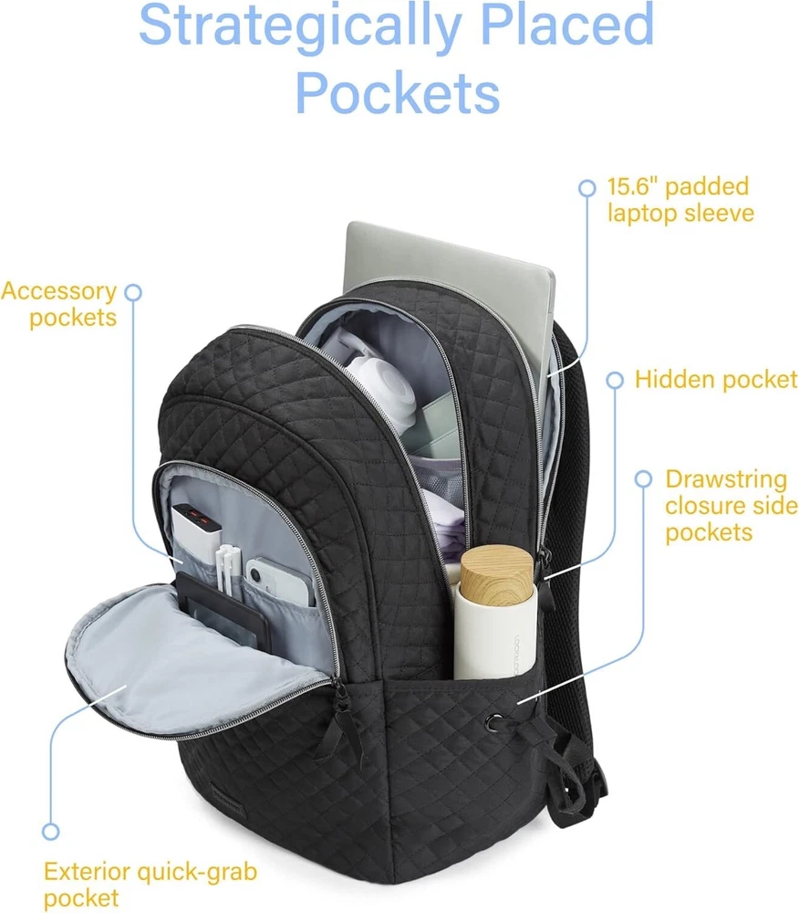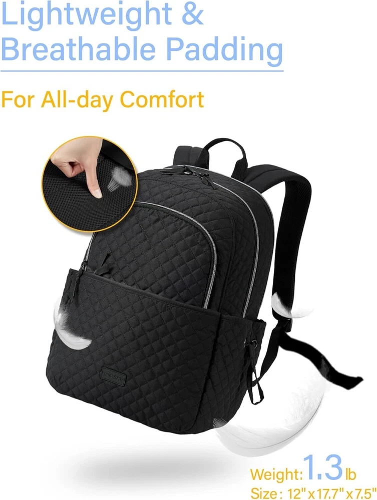 BAGSMART Travel Laptop Backpack, Quilted Work Bookbag Fits 15.6 Inch Laptop, Laptop Backpack with Charging Port Hole, Lightweight Bookbag for College Work Business, Classic Black