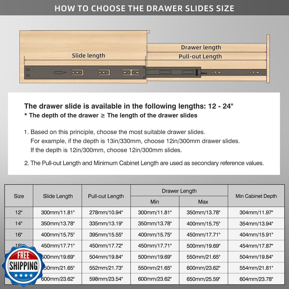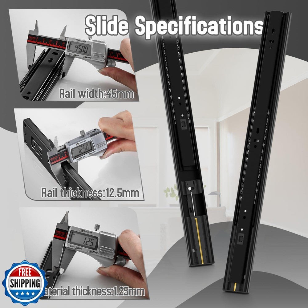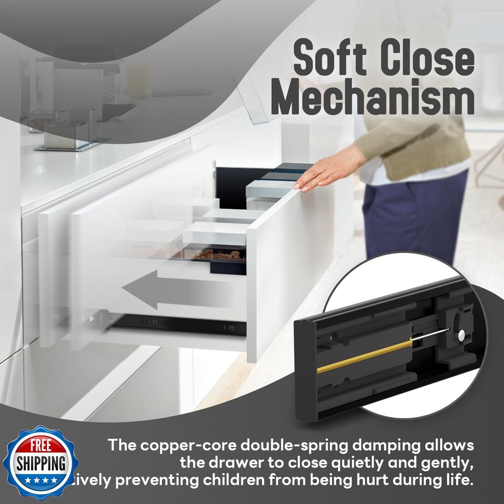 BAIDICE 5 Pair Soft Close Drawer Slides Rails 12 14 16 18 20 22 24 Inch 100 lb Load Capacity Side Mount Full Extension Cabinet Runner Self Slow Closing Ball Bearing Metal Dresser Glide Track Black Features 【Soft Close】 The self-closing drawer slide rail adopts a new copper hydraulic buffer double-spring structure, thus reducing noise when closing the drawer.For that reason,it is normal to encounter some resistance when pulling the slider apart. 【 Made of Cold-rolled Steel】 The drawer slide rail is made of 1.2mm high-quality cold-rolled steel. Soft-close drawer slides can carry 100 pounds.Corrosion and oxidation resistance.If you have any questions about the slides, please contact our customer service department. 【What you get】You would get 5 pairs of 24-inch drawer slides, mounting screws and instructions to make installation easier. Each drawer slide is individually wrapped and beautifully packaged. 【Full Extension & Removable】 There is a black plastic buckle on the back of the slide rail, which can be easily disassembled by pressing the inner rail, which is convenient for installation. Fully extendable rails make storage easy. 【Installation Guide】Slides Length: 23.62"(600mm), pull-out length:23.54"(598mm), suitable for drawers with internal depth ≥ 23.62". Left mounting clearance: 0.5" (12.7mm), right mounting clearance: 0.5" (12.7mm). Mounting screws are included in both ends of the product package. When installing, please push the inner ball bearings to the top of the slide rail first, then connect it with the slide rail, and finally complete the installation with a slight push. Shipping Free & Fast Shipping: We offer free shipping to most of the USA with a normal delivery time of 3-7 days. However, due to the current situation, additional delivery time (up to 3 weeks) may be required for some items. Alternative Carriers: We may use alternative carriers (e.g., USPS, FedEx, UPS) to ensure your package arrives safely and on time. Due to the use of multiple carriers, we are unable to provide a tracking number automatically. Handling Time: Orders are processed and shipped within 1-2 business days of receiving cleared payment. Shipping Restrictions: Shipping to Alaska, Hawaii, Puerto Rico, Guam, and other US territories may incur shipping charges or delivery restrictions. Please contact us before ordering, or your order can be refunded/cancelled. State Restrictions: Certain items may not be shipped to California due to state regulations. Contact for Tracking Updates: If you require tracking updates or have any concerns about the delivery of your order, please feel free to contact us, and we will be happy to assist you. Return Policy 30-Day Hassle-Free Returns: If you are not completely satisfied with your purchase, you can return the item for free within 30 days of receiving it for a full refund or exchange. Easy Return Process: Contact us, and we will provide you with a prepaid return shipping label and detailed instructions. No Restocking Fee: There are no restocking fees for returns. However, the buyer is responsible for return shipping costs if the return is not due to a seller's error. Refund Processing: Refunds will be processed within 1 business day of receiving the returned item in its original condition. Payment We accept all major credit cards, PayPal, and Apple Pay for your convenience. Your payment information is secure and encrypted to ensure a safe and seamless transaction. Please complete your payment within 3 days of purchase to avoid any delays in shipping. Feedback Your feedback is extremely important to us. We strive to provide the best products and customer service possible. If you are satisfied with your purchase, please take a moment to leave us a positive review. If you have any concerns or issues with your order, please contact us before leaving negative feedback. We are committed to resolving any problems and ensuring your satisfaction. Contact Us If you have any questions or concerns, please feel free to reach out to our customer support team. You can contact us through the eBay messaging system. We are available Monday to Friday, 9:00 am to 5:00 pm EST, and we will do our best to respond to your inquiry within 24 hours. Thank you for supporting our small family business!