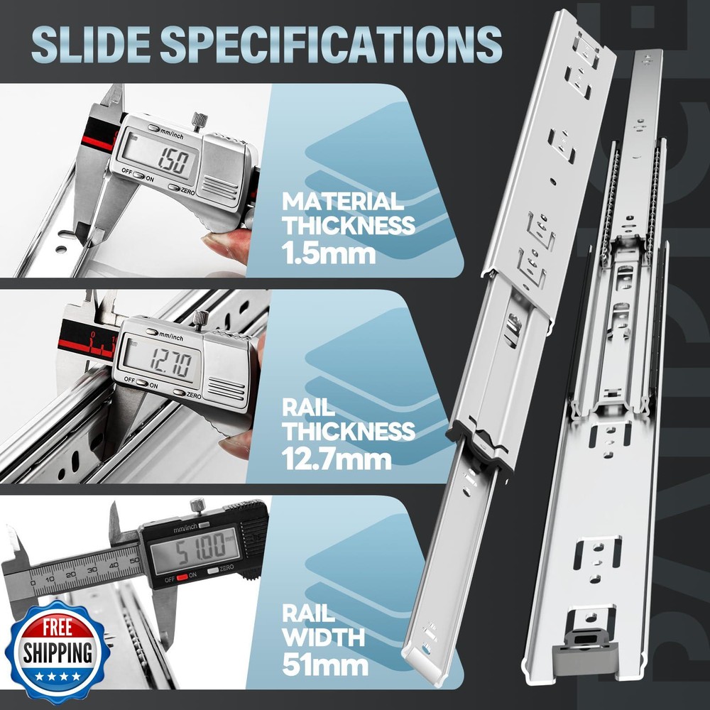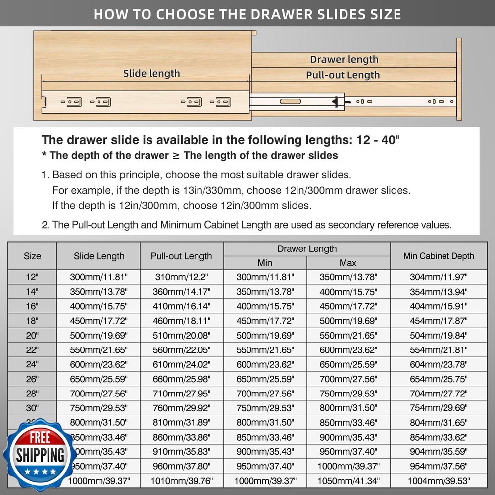 BAIDICE 1 Pair Heavy Duty Drawer Slides 12 14 16 18 20 22 24 26 28 30 32 34 36 38 40 Inch 150 lb Load Capacity Side Mount Full Extension Ball Bearing Rail Runner Features 【Max Load Capacity 150lb, 30-year Service Life】 All three sections of rails are made of 1.5mm Q235 thick steel plate, high-strength、 high-density、 high-quality cold-rolled steel. It can support heavy load storage without deformation, and the bottom is equipped with a limited rubber pad, which is made of ABS plastic, with good wear resistance and impact resistance. After testing, the number of opening and closing times has reached more than 150,000 times. 【Removable Ball-bearing Drawer Slides】 Two sets of ball bearings are designed inside the slides, all of which are made of solid steel balls. In addition to maintaining the fluidity of the slides, they can also effectively increase the load-carrying capacity of the slides. Hidden removable button on the back, push to remove slides for easy installation and cleaning of drawers. 【Full Extension Slides, Double Anti-rust】Full extension heavy duty drawer slides support access to the whole space, and the drawers can be pulled out completely for easy storage of items. The surface of the slide rail is treated with galvanized blue sealing process, which isolates the slide rail from direct contact with air and water, and enhances oxidation resistance and corrosion resistance. 【Installation Requirements】 Length: 17.72"(450mm); Full extension length: 35.83"(910mm); Installation clearance: Left: 0.50" (13mm); Right: 0.50" (13mm). You can choose the size of the rails according to the depth of the drawer. The length of the rail should be less than or equal to the drawer. Please refer to the image above. 【About Screws】 1. This product comes with 8 M4 screws. Due to different usage scenarios, please purchase other suitable screws by yourself. 2. When installing the product, please push the inner ball bearing to the top of the slide, then attach it to the slide, and finish the installation. Shipping Free & Fast Shipping: We offer free shipping to most of the USA with a normal delivery time of 3-7 days. However, due to the current situation, additional delivery time (up to 3 weeks) may be required for some items. Alternative Carriers: We may use alternative carriers (e.g., USPS, FedEx, UPS) to ensure your package arrives safely and on time. Due to the use of multiple carriers, we are unable to provide a tracking number automatically. Handling Time: Orders are processed and shipped within 1-2 business days of receiving cleared payment. Shipping Restrictions: Shipping to Alaska, Hawaii, Puerto Rico, Guam, and other US territories may incur shipping charges or delivery restrictions. Please contact us before ordering, or your order can be refunded/cancelled. State Restrictions: Certain items may not be shipped to California due to state regulations. Contact for Tracking Updates: If you require tracking updates or have any concerns about the delivery of your order, please feel free to contact us, and we will be happy to assist you. Return Policy 30-Day Hassle-Free Returns: If you are not completely satisfied with your purchase, you can return the item for free within 30 days of receiving it for a full refund or exchange. Easy Return Process: Contact us, and we will provide you with a prepaid return shipping label and detailed instructions. No Restocking Fee: There are no restocking fees for returns. However, the buyer is responsible for return shipping costs if the return is not due to a seller's error. Refund Processing: Refunds will be processed within 1 business day of receiving the returned item in its original condition. Payment We accept all major credit cards, PayPal, and Apple Pay for your convenience. Your payment information is secure and encrypted to ensure a safe and seamless transaction. Please complete your payment within 3 days of purchase to avoid any delays in shipping. Feedback Your feedback is extremely important to us. We strive to provide the best products and customer service possible. If you are satisfied with your purchase, please take a moment to leave us a positive review. If you have any concerns or issues with your order, please contact us before leaving negative feedback. We are committed to resolving any problems and ensuring your satisfaction. Contact Us If you have any questions or concerns, please feel free to reach out to our customer support team. You can contact us through the eBay messaging system. We are available Monday to Friday, 9:00 am to 5:00 pm EST, and we will do our best to respond to your inquiry within 24 hours. Thank you for supporting our small family business!
