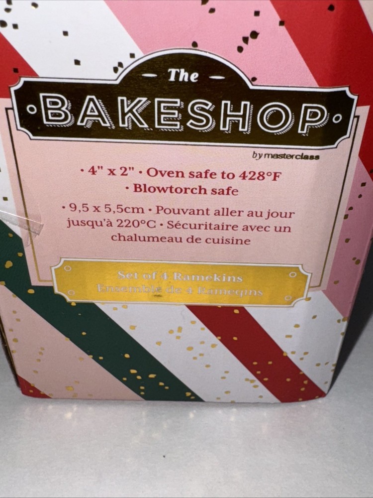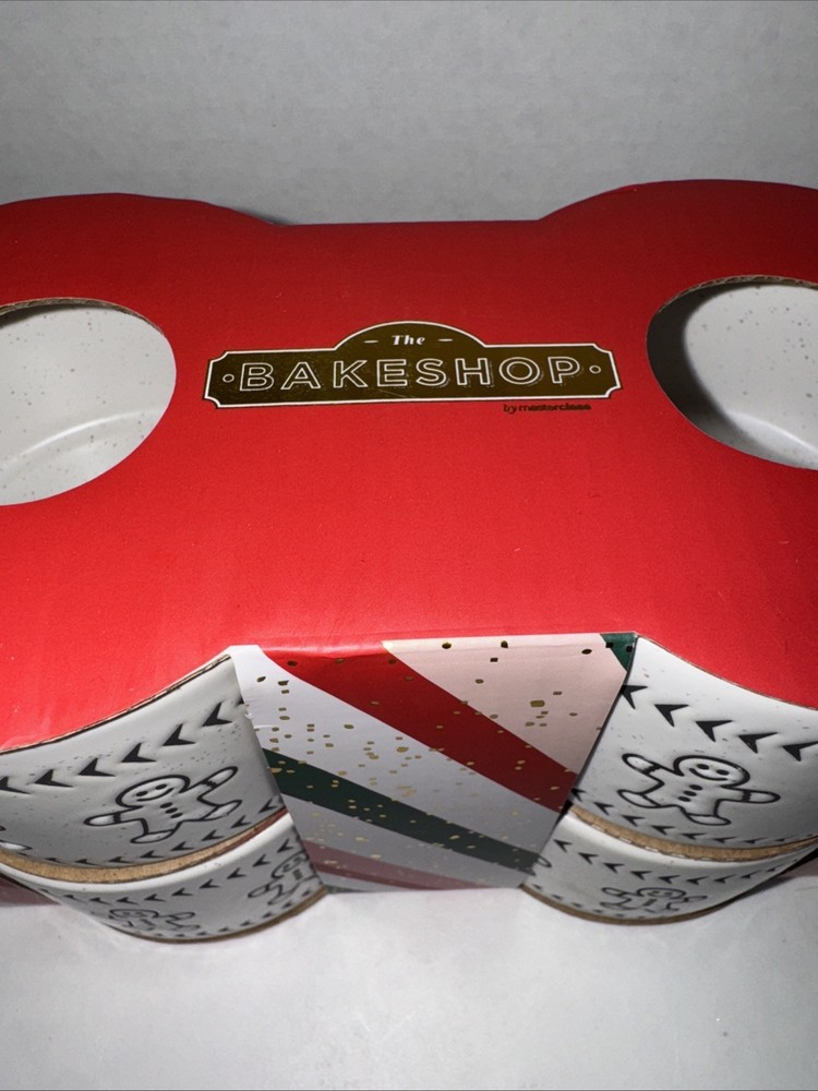 Set of 4 Bakeshop Gingerbread Man Ceramic Ramekins, perfect for the Christmas season. These white ramekins feature a cute gingerbread man pattern and are made of sturdy stoneware material. Each ramekin measures 4 inches in width and 2 inches in height, making them perfect for serving desserts or appetizers to your guests. Comes in a box of 4, making it easy to store and display. Great addition to any kitchen or dining room collection.
