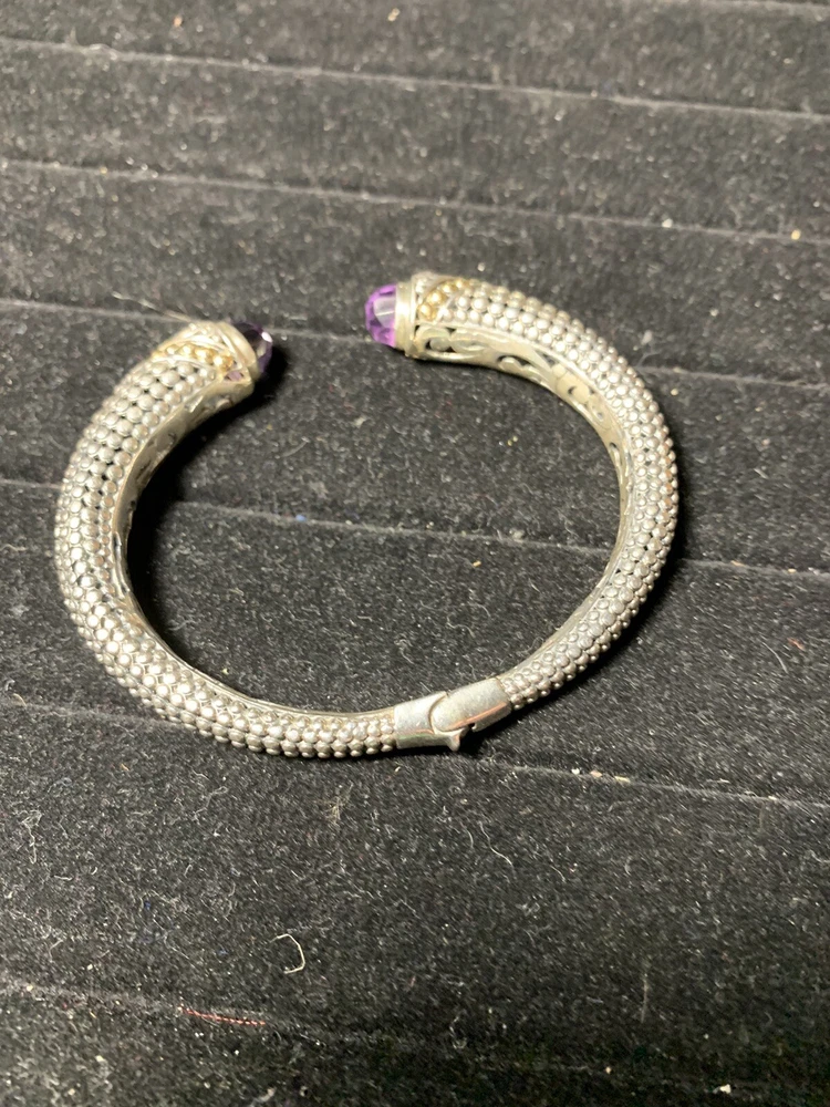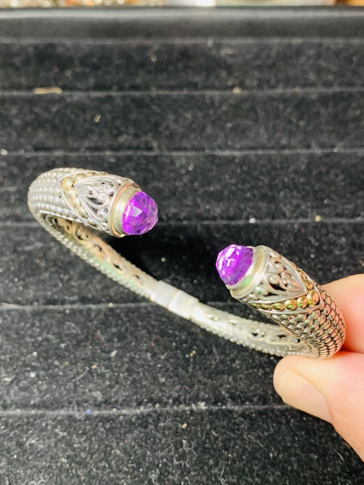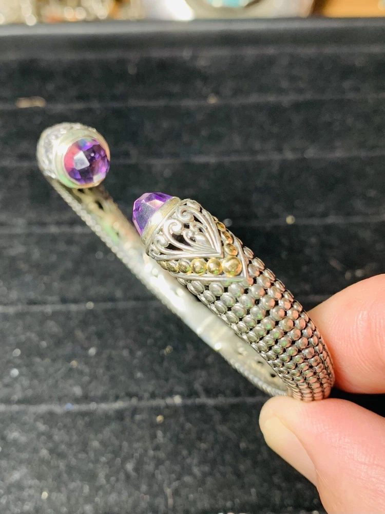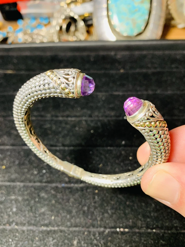 Bali Indonesia Robert Manse sterling silver and solid 18K accent bead faceted amethyst hinged bangle bracelet weighing 22.8 grams and remaining in very good pre-owned condition Shipping is $5.99 via Ground Advantage Please don’t hesitate to reach out with any questions or concerns you may have, and buy with confidence. I have perfect feedback as a seller with over 1500 completed sales Thank you very much for your interest, and best of luck!