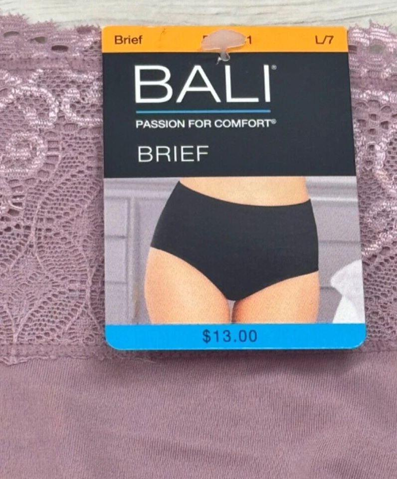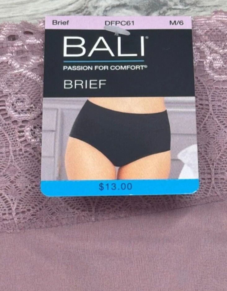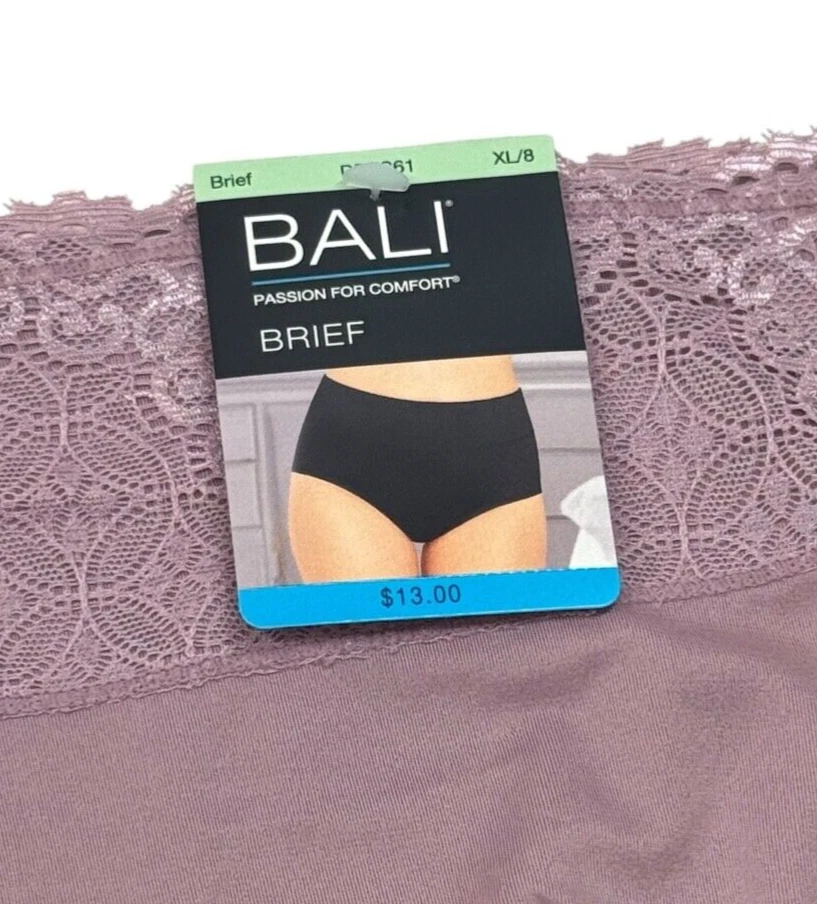 BALI Passion For Comfort Lace Waist Brief Panty Purple Mauve Women M L XL DFPC61 New With Tags! Women’s Size Available: MEDIUM/6 LARGE/7 X-LARGE/8 Style: DFPC61 Color Code : SMOKEY PURPLE MAUVE Body: 78% Nylon 22% Spandex Double Gusset: 100% Cotton Retail Price: $13.00 + Tax Machine Washable Imported