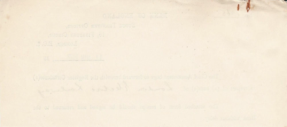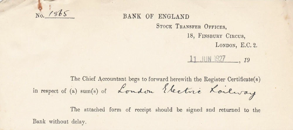 BANK OF ENGLAND, Stock Transfer Offices, London 1927 L.E.Railway Slip Ref 46279