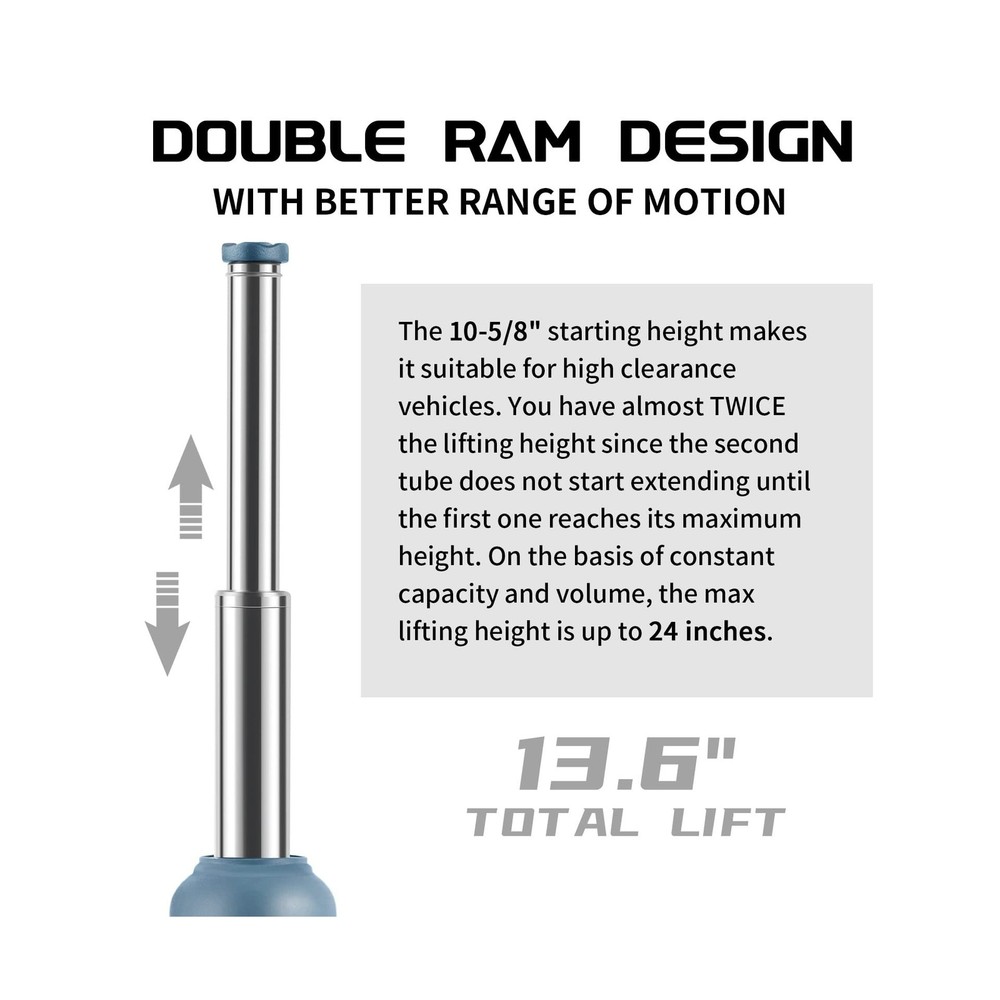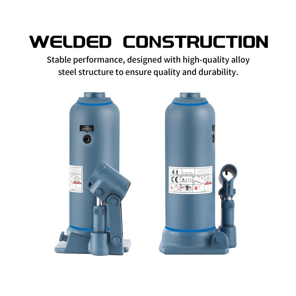 BAOSHISHAN 4 Ton Bottle Jack 10-5/8" to 24" Lifting Range High Lift Double Ram Bottle Jack Hydraulic Welded Jack Truck Jack Description Features: [HIGH LIFT JACK] - This welded jack breaks through the traditional design, which have DOUBLE RAM. You have almost TWICE the lifting height since the second tube does not start extending until the first one reaches its maximum height. On the basis of constant capacity and volume, the max lifting height is up to 24 inches. [FOR HIGH CLEARANCE VEHICLE] - The minimum height of this jack is 10.43 inches. If your car's clearance is smaller than this height, it is not recommended to use this Jack. It is suitable for high clearance vehicles, such as SUVs, trucks, jeeps, etc. [STURDY STRUCTURE] - Designed with high-quality alloy steel structure to ensure quality and durability. Inner/outer welded structure, longer service life and stronger overall structure. The pressure pump is designed to lift with minimal effort. [PARAMETERS] - Rated capacity: 4 ton (8,000 lbs) | Max height: 610mm/24.02" | Min height: 265mm/10.43" | Lifting height: 345mm/13.58" | Net Weight: 7.1kg/15.65lbs Product Details: Vehicle Service Type: Car, Truck Material: Alloy Steel Load Capacity: 4 tons Brand: BAOSHISHAN Color: Blue Gray Brand Name: BAOSHISHAN Manufacturer: BAOSHISHAN Color: Blue Gray Style Name: Sturdy Compatible with Vehicle Type: Car, Truck Load Capacity: 4 tons Item Weight: 7.1 Kilograms Item Dimensions: 5 x 4.88 x 10.43 inches Minimum Height: 10.43 Inches Material Type: Alloy Steel Delivery We Do Not Ship Outside of the Continental US. Return Policy All items qualify for returns within 30 days of receipt. Seller is responsible for return shipping on any item that is not damaged. Feedback We take our reputation seriously, we buy and sell online, so we understand the value of trust. If you are unsatisfied with your order, please contact us and we will work with you to resolve it to your satisfaction.