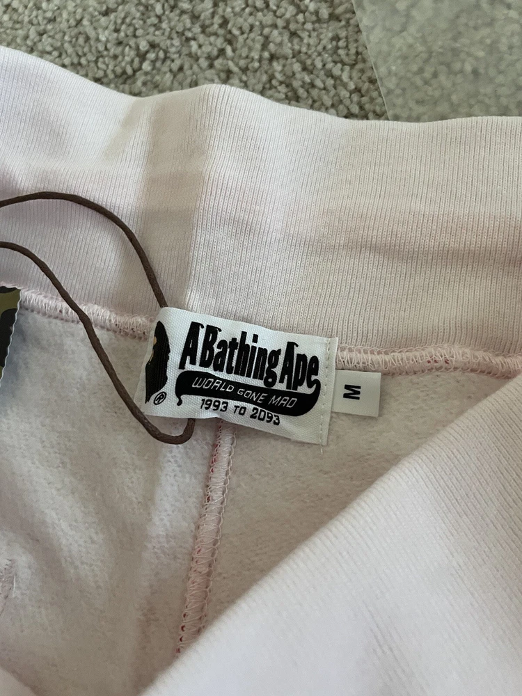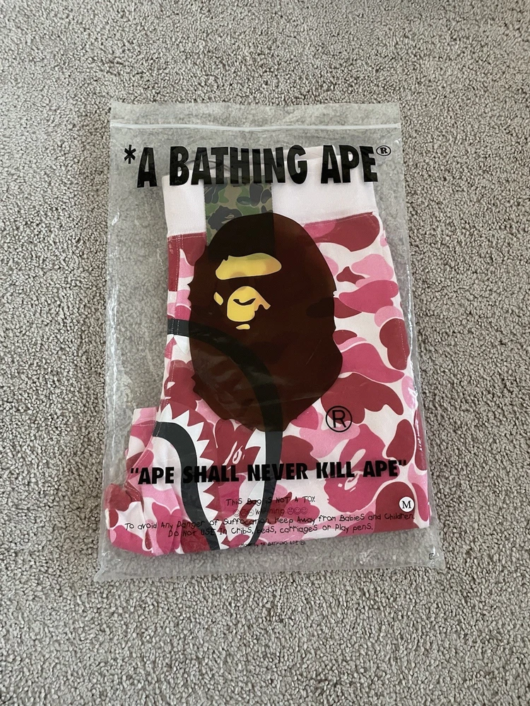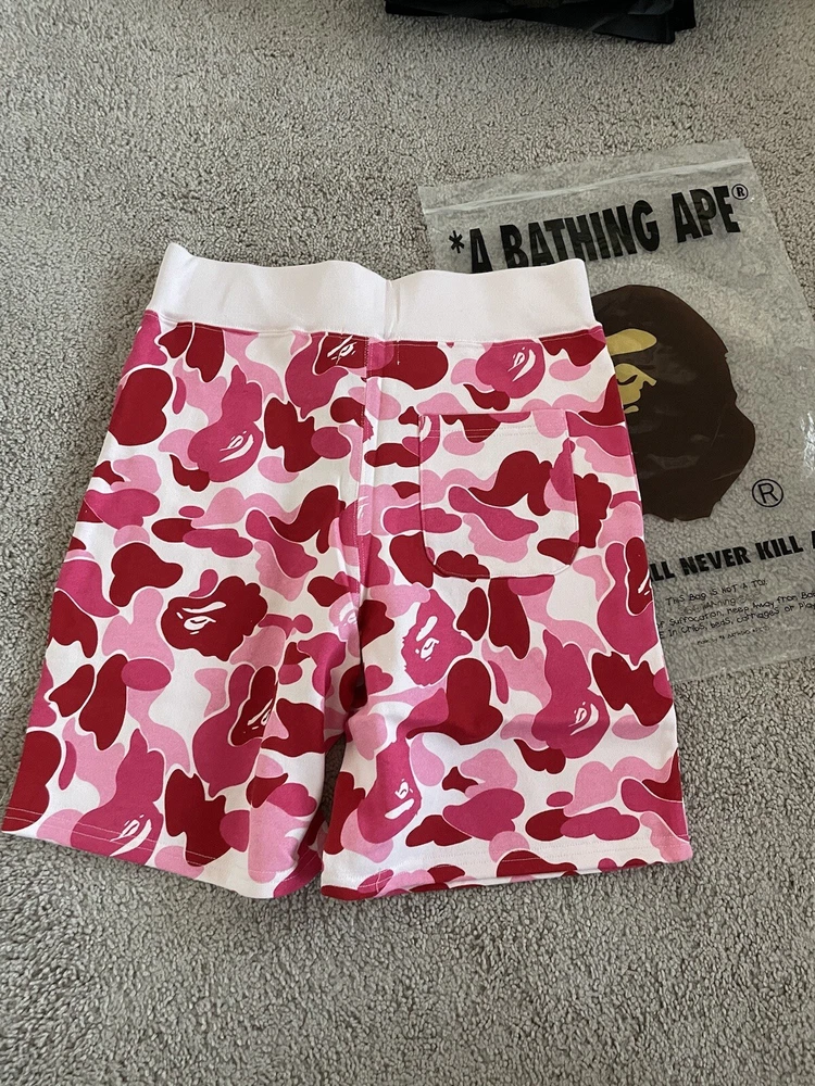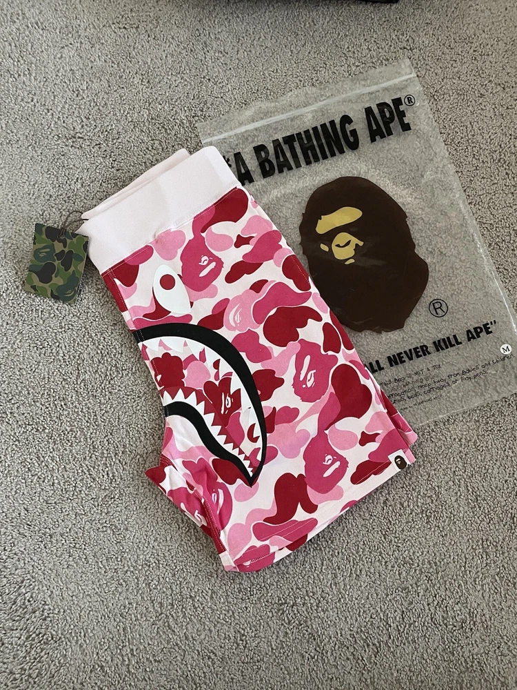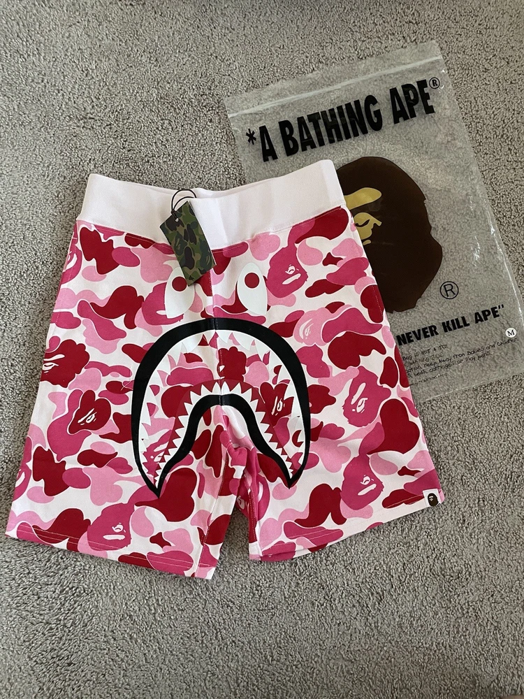 Get ready to turn heads with these BAPE Big ABC Camo Shark Sweat Shorts in Pink. These regular fit shorts feature a bold camouflage pattern and are made from high-quality fabric that is sure to last. With a medium wash, these shorts are perfect for everyday wear and will easily match any outfit. The A Bathing Ape brand is known for its unique and colorful designs, and these shorts are no exception. They are perfect for men who want to add a pop of color to their wardrobe. Whether you're going out for a night on the town or just running errands, these shorts are sure to make a statement.